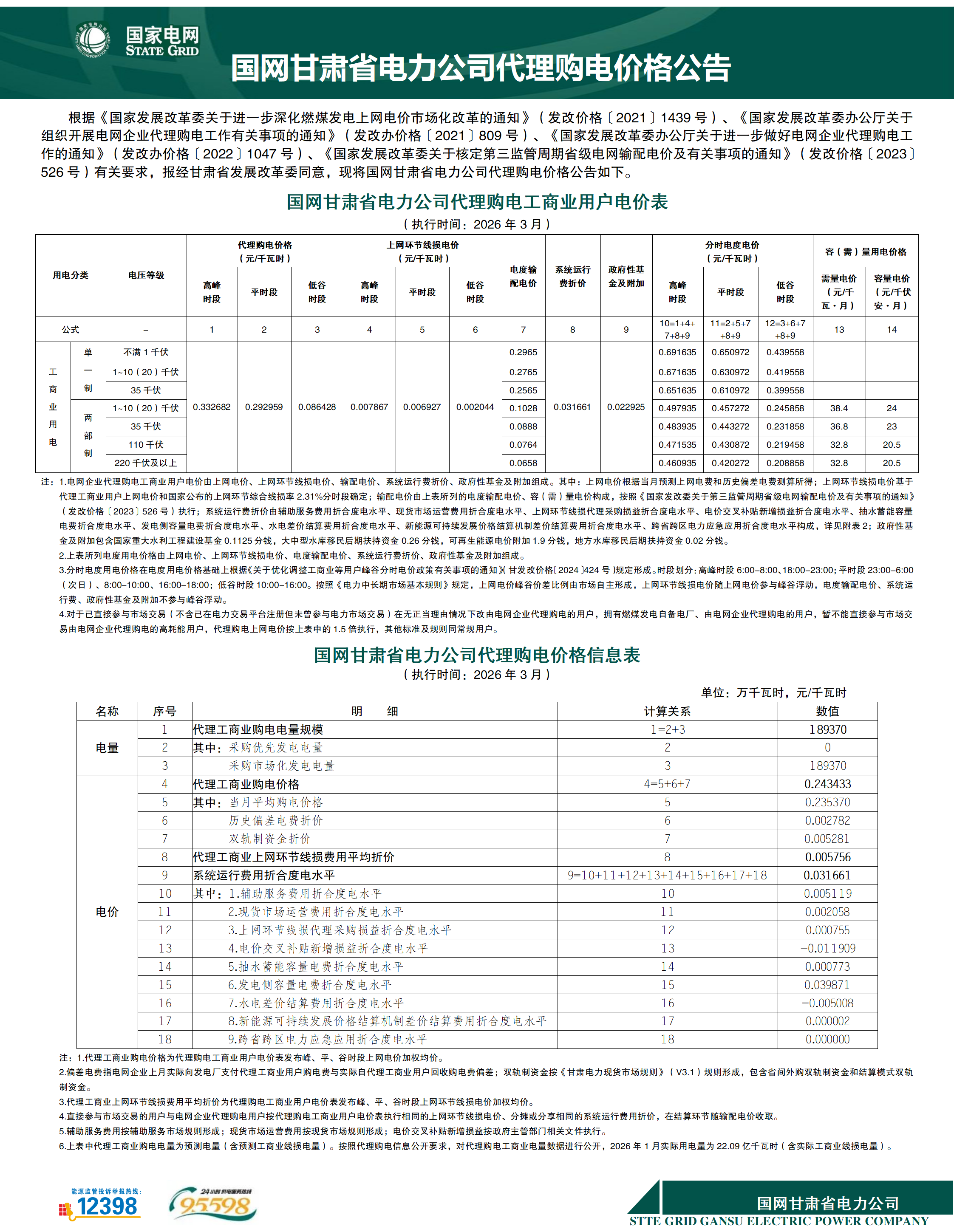 甘肃省3月工商业电价