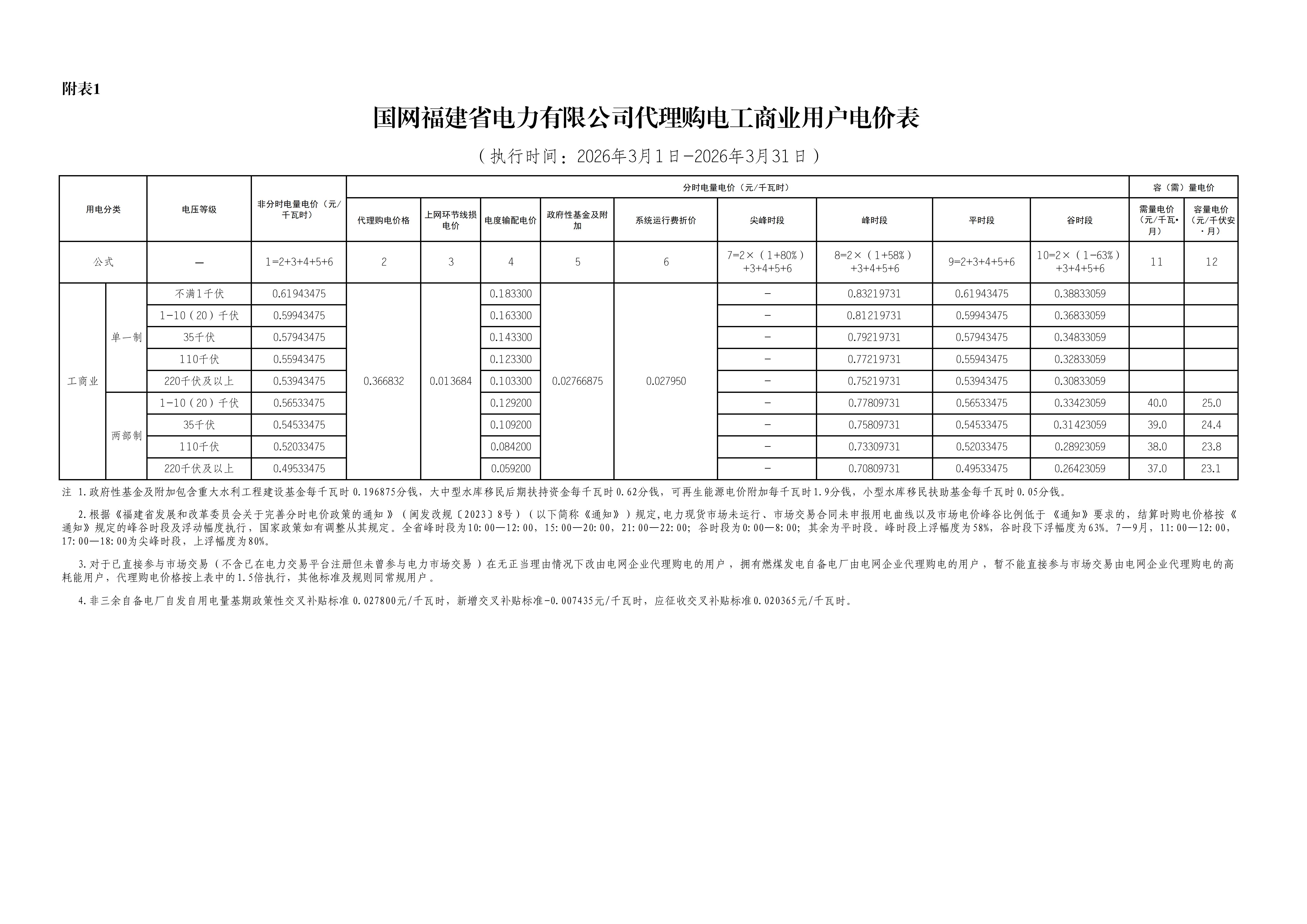 福建省3月工商业电价