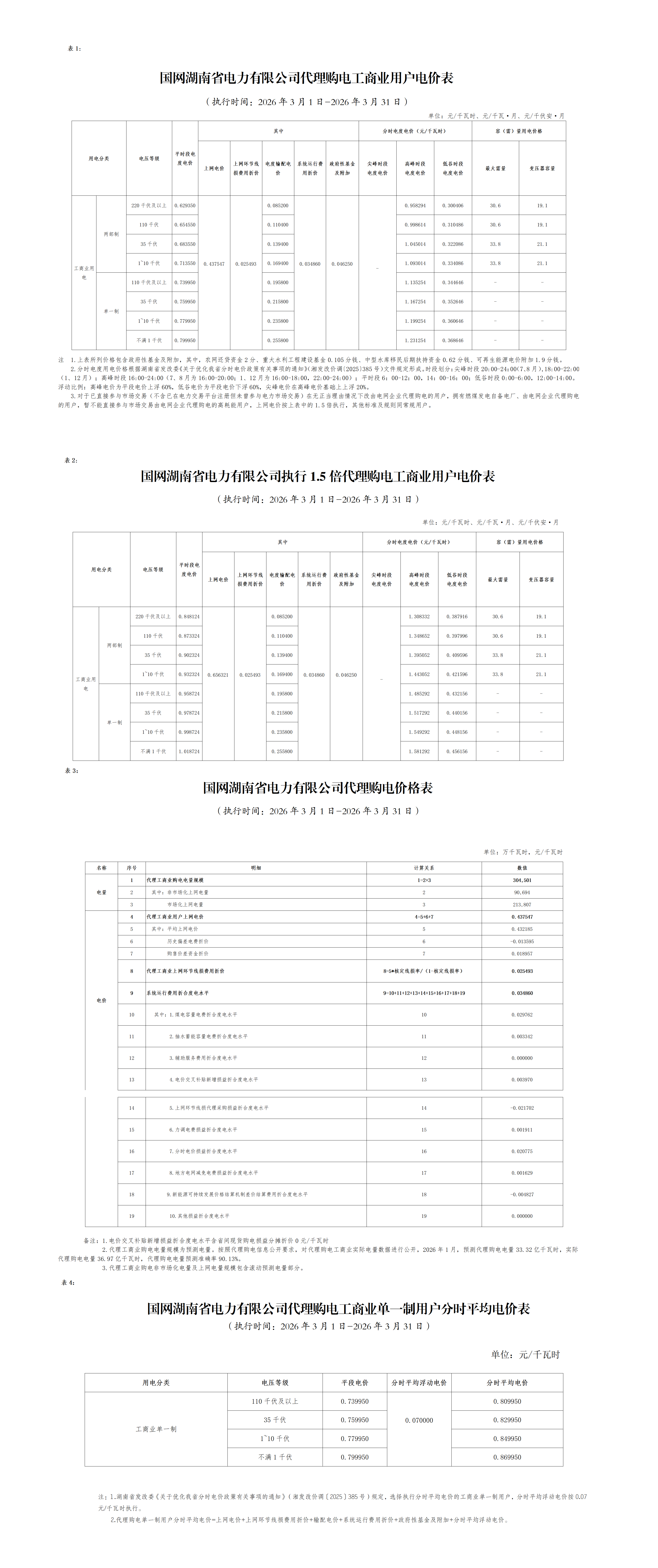 湖南省3月工商业电价