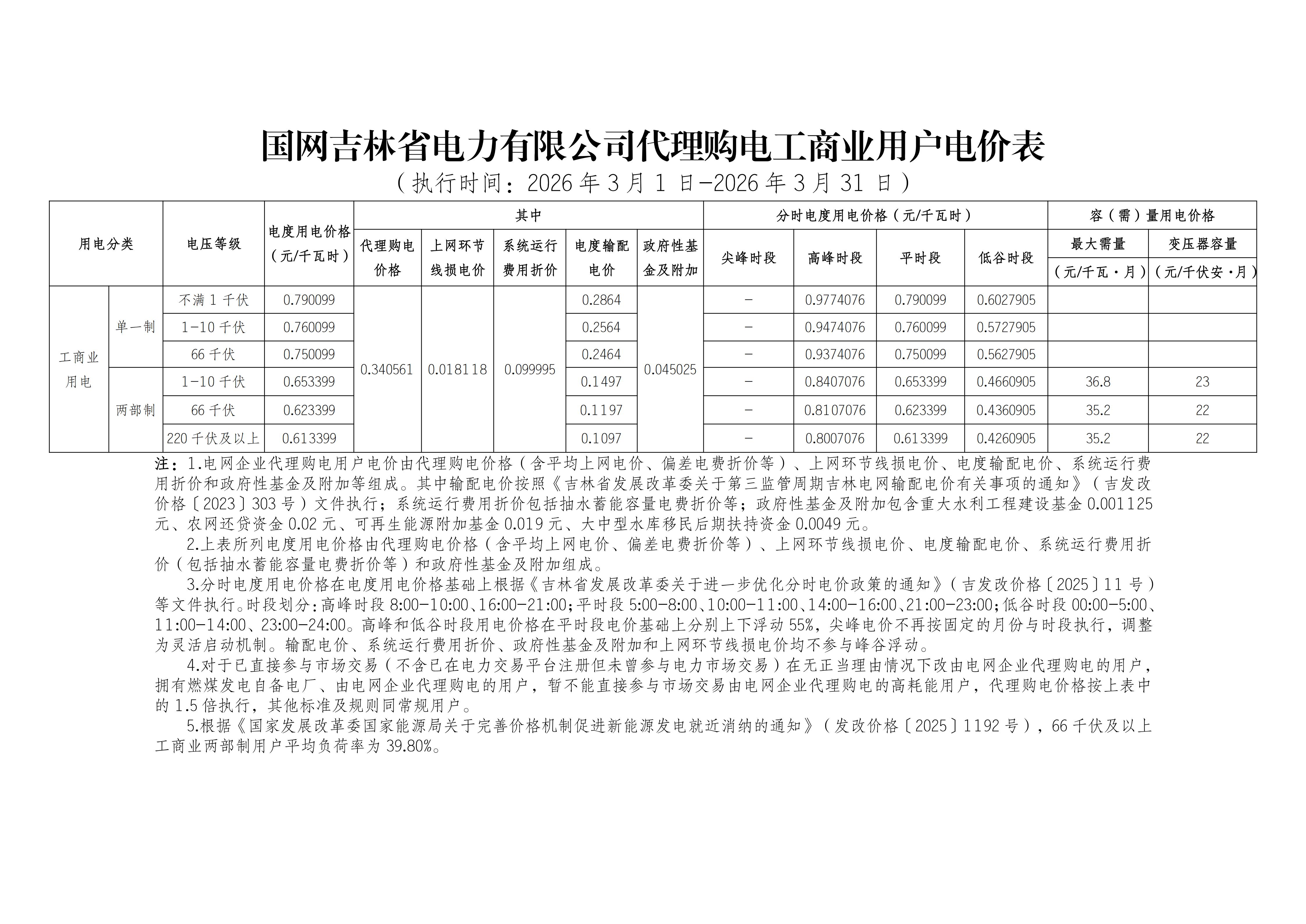 吉林省3月工商业电价