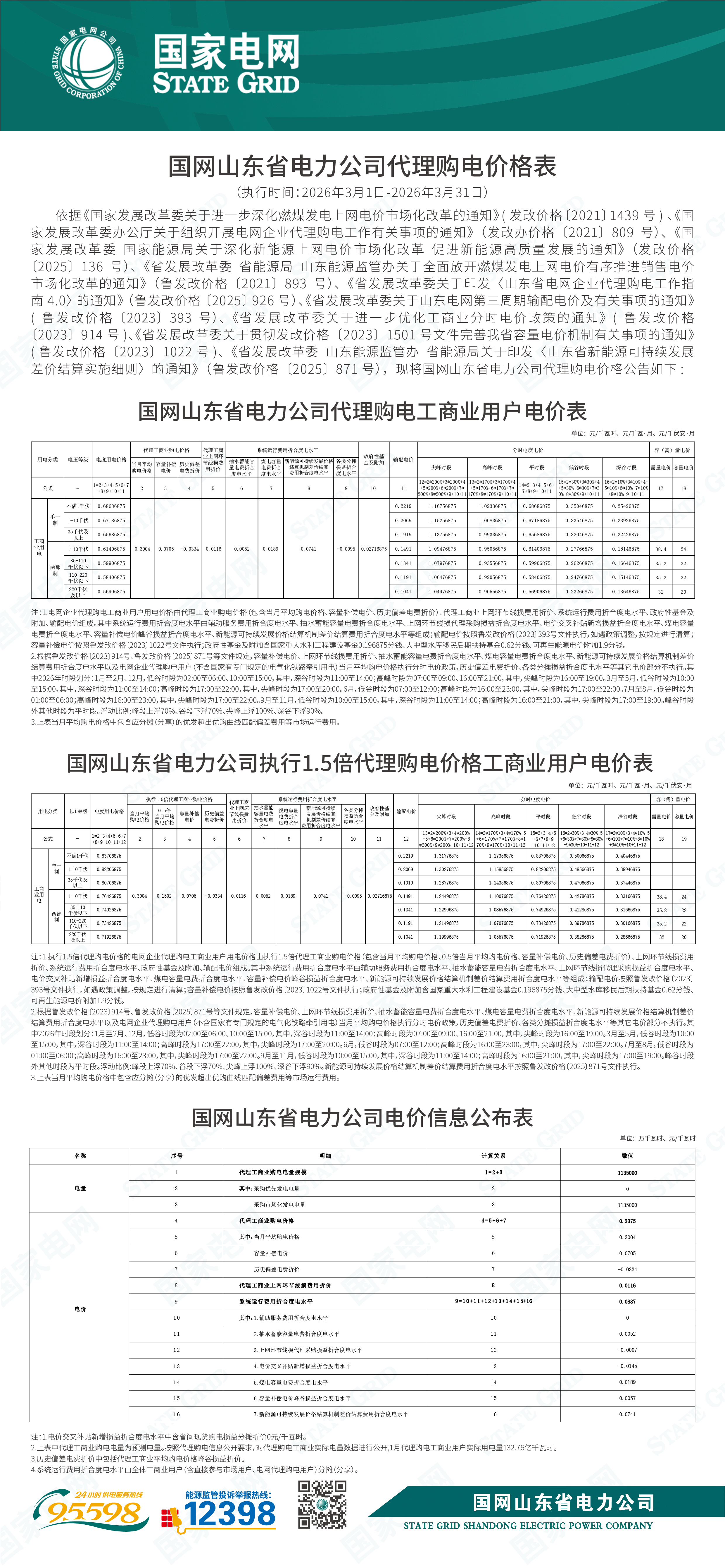 山东省3月工商业电价