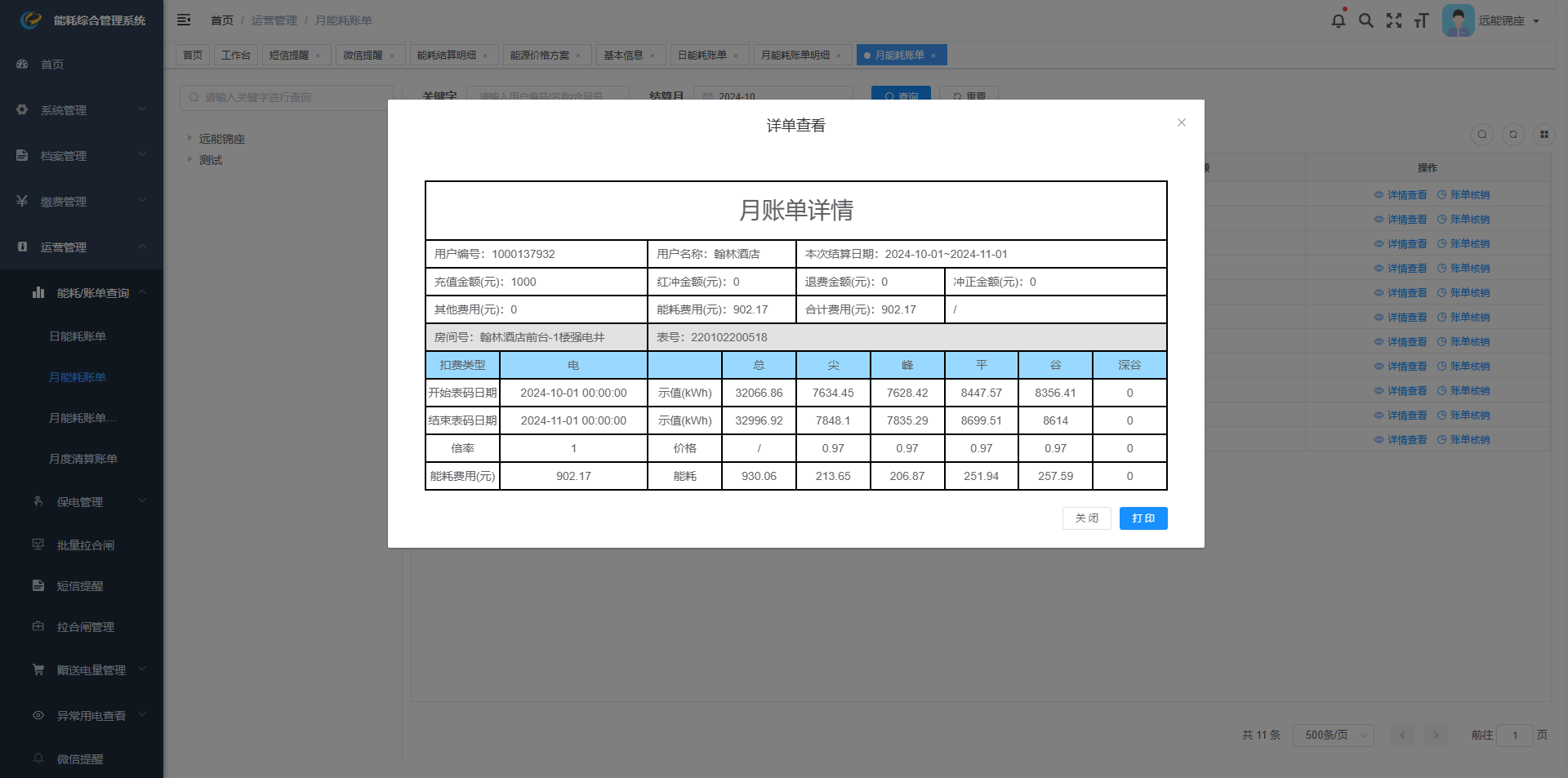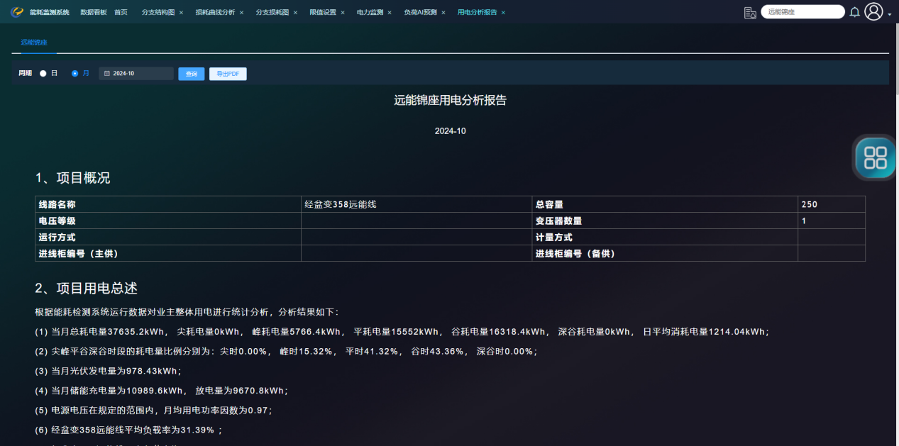 7) 以变压器为单位,按日,按月自动生成用能分析报告,包括供电量、售电量、变压器运行工况及整改建议。