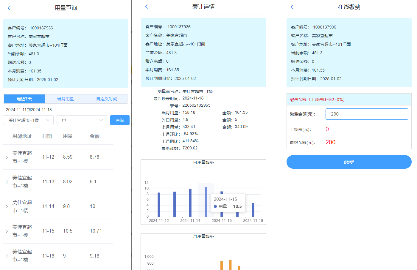 用户可以在手机端查询每天、每月的用电情况,可以通过手机随时缴纳电费,让用户用电清晰明了,降低管理人员的工作量,提高用户体验感。