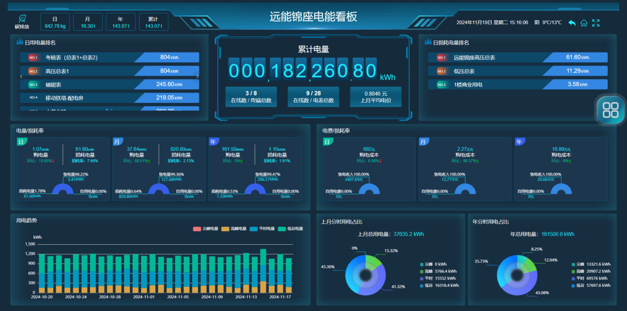 项目于2022和2024年、分两期按上述方案进行了改造,依托数字能源管理平台(四个子系统:预付费管理系统、光储一体系统、能耗监测系统、配电监测系统),实现各级计量电表准确计量、自动抄表、智能预付费管理、用户手机缴费、自动损耗计算与分析、智能配电监测等功能,完善“量价费损”精益化管理体系,把项目建设为“源网荷储”智能一体化数字能源楼宇。
