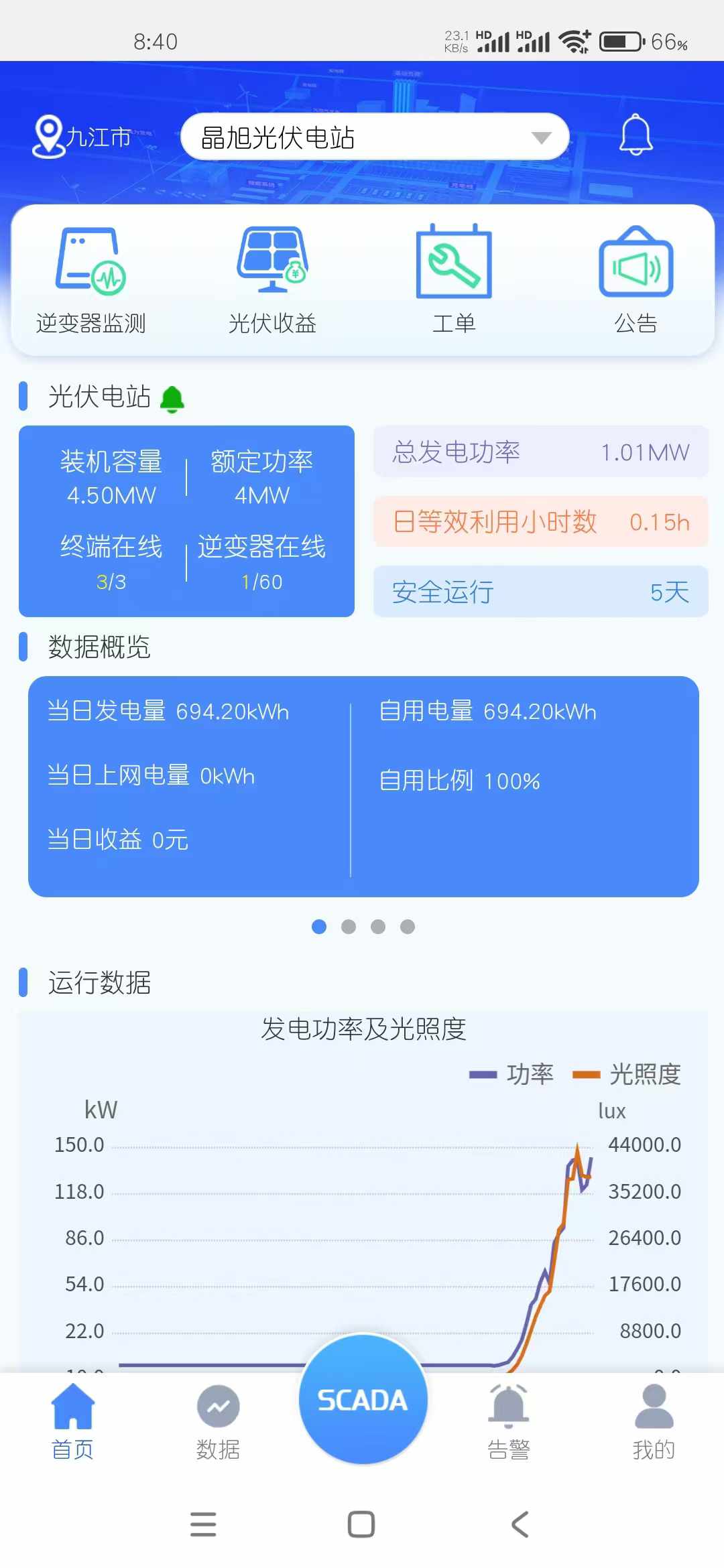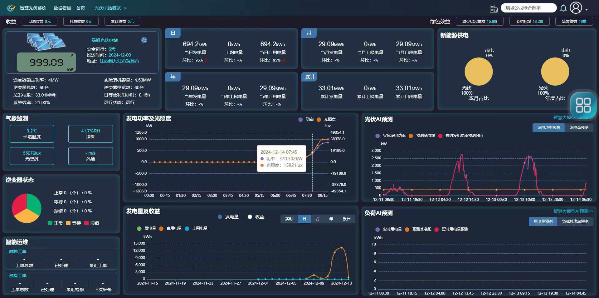 项目概况:位于濂溪产业园的九江晶旭新能源有限公司,是一家集太阳能技术研发、太阳能组件生产、太阳能市场化应用、太阳能解决方案为一体的科技智造企业。通过慧明谦智慧光伏系统具备发电统计分析(发电量、功率、效率、收益等)、智能监控(温湿度、光照度、风速等)、发电AI预测(短时、长时)、智能告警等功能实现智能化运维管理。