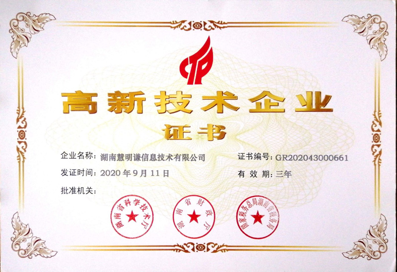 2020年是特别的一年,湖南慧明谦信息技术有限公司凭借专业的研发队伍,雄厚的技术实力,持续的创新能力,科学的企业管理,被顺利地认定为国家高新技术企业。