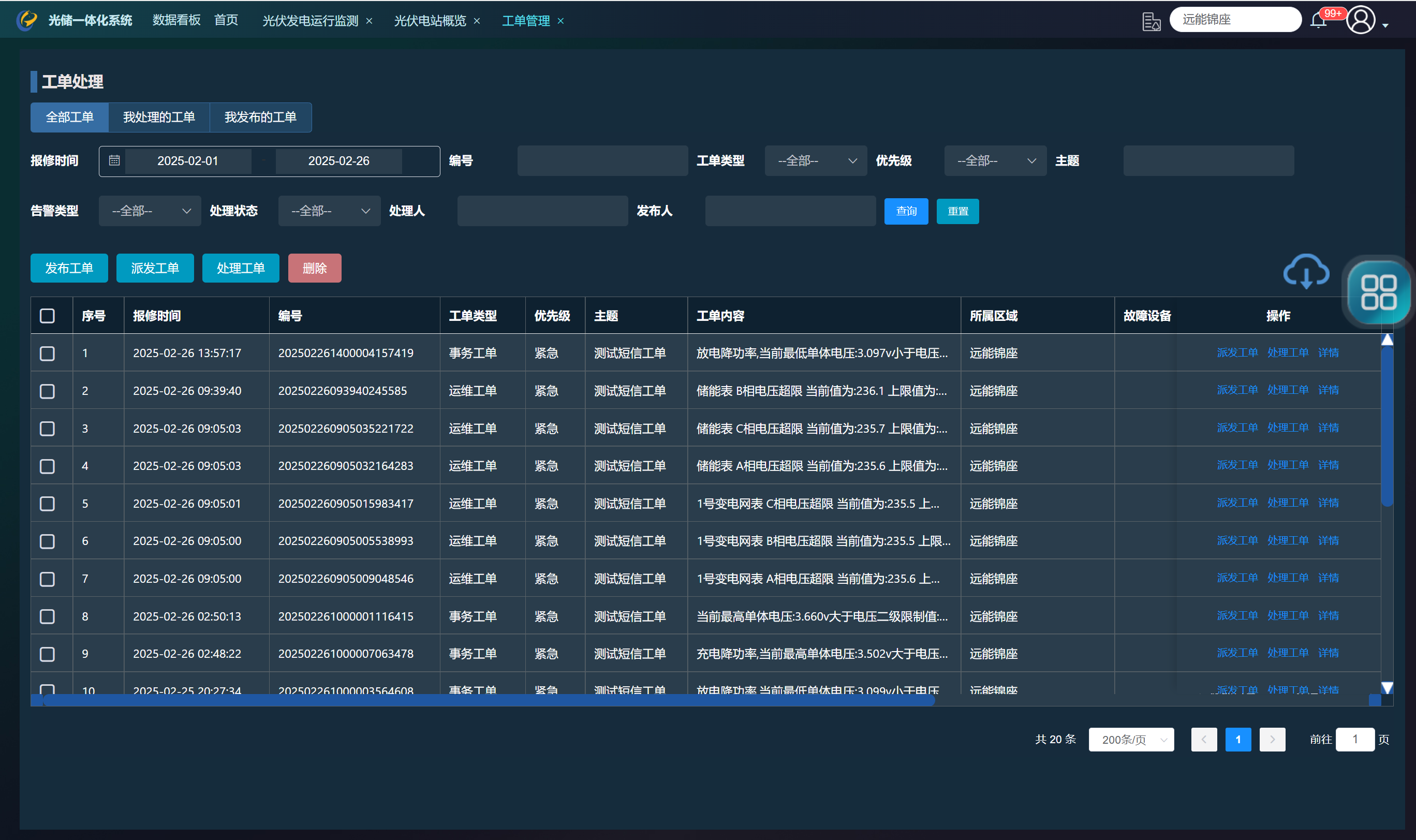 光伏运维管理系统主要是通过数据采集、监控、分析、预测等手段,实时跟踪光伏发电设备的运行状况,优化运维流程,提高设备的可靠性和使用寿命,降低设备维护工作量,运维模式由原来的计划运维变为按需运维。该系统能够监测各类光伏设备(如光伏组件、逆变器、配电设备等)的工作状态,及时发现潜在故障,自动报警并提供处理建议。