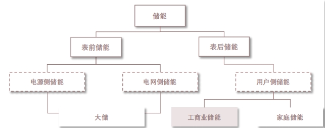 储能是指通过介质或设备把能量存储,在需要时再释放的过程。工商业储能是储能市场重要组成部分。储能根据应用终端划分,可分为电源侧、电网侧、用户侧储能;其中,电源侧、电网侧储能又称为表前储能或大储,用户侧储能又称为表后储能;用户侧储能分为工商业储能与家庭储能。目前,中国用户侧储能基本以工商业储能为主。