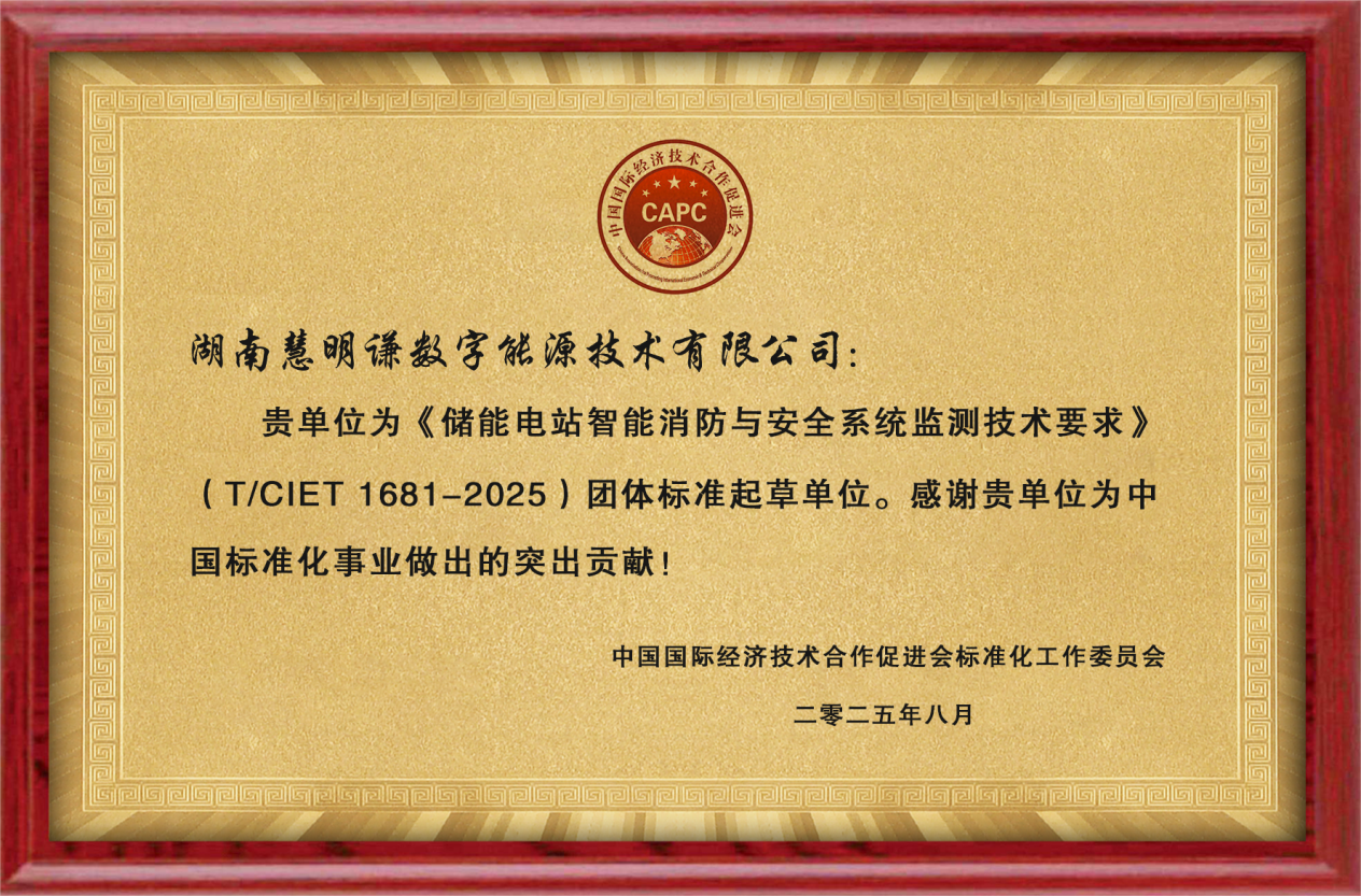 近年来,随着“双碳”战略的纵深推进,储能产业驶入“快车道”。然而,储能电站在高能量密度、高功率运行场景下,火灾与安全事故风险日益凸显,行业亟需一套科学、统一、可落地的智能消防与安全监测“标尺”。近日,由湖南慧明谦数字能源技术有限公司(以下简称“慧明谦”)汪文红、陈顺飞两位专家深度参与起草的《储能电站智能消防与安全系统监测技术要求》团体标准正式发布;同时,两位专家荣获标准起草“荣誉证书”,为公司在储能安全领域再添一枚“军功章”。