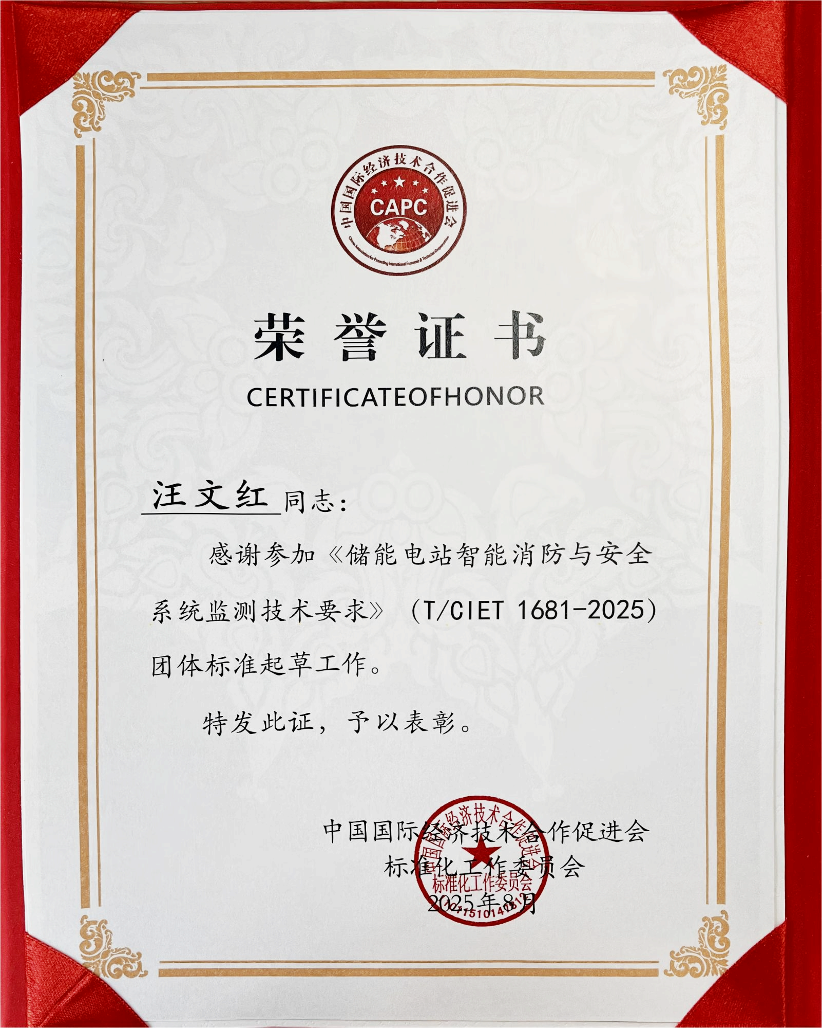 中国国际经济技术合作促进会(标准化工作委员会)向汪文红、陈顺飞颁发“标准起草荣誉证书”,以表彰其在提升储能电站安全水平、填补行业空白方面作出的突出贡献。汪文红表示:“荣誉属于团队,更属于湖南这片创新沃土。下一步,我们将把标准‘软约束’转化为产品‘硬实力。