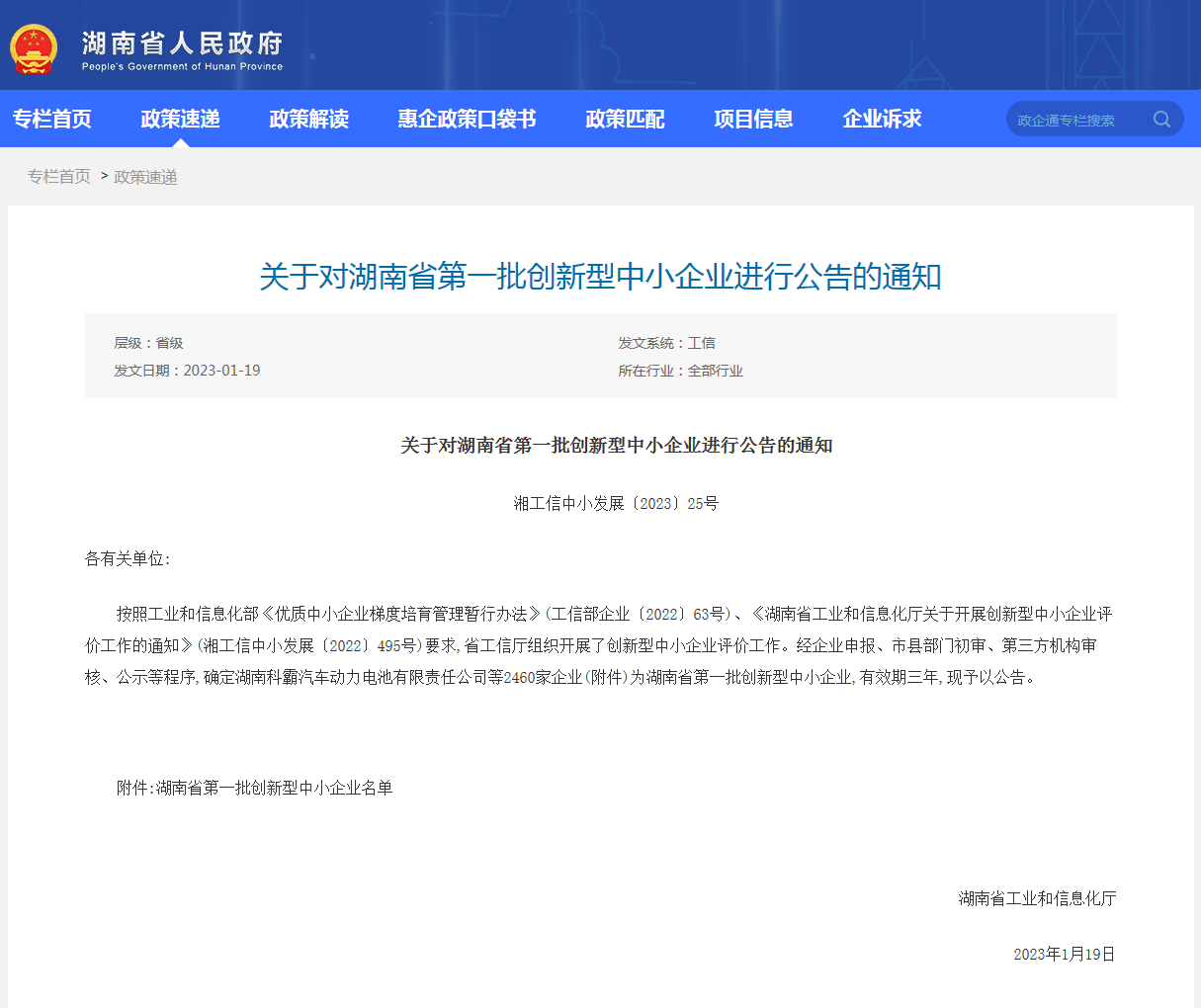 关于对湖南省第一批创新型中小企业进行公告的通知 -政企通-湖南省人民政府门户网站