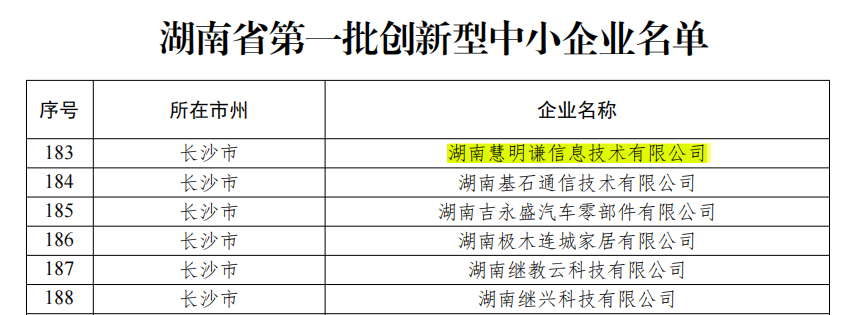 按照工业和信息化部《优质中小企业梯度培育管理暂行办法》、《湖南省工业和信息化厅关于开展创新型中小企业评价工作的通知》,省工信厅组织开展了创新型中小企业评价工作,经市县部门初审、第三方机构审核、公示等程序,湖南慧明谦信息技术有限公司被顺利确定为湖南省第一批创新型中小企业。