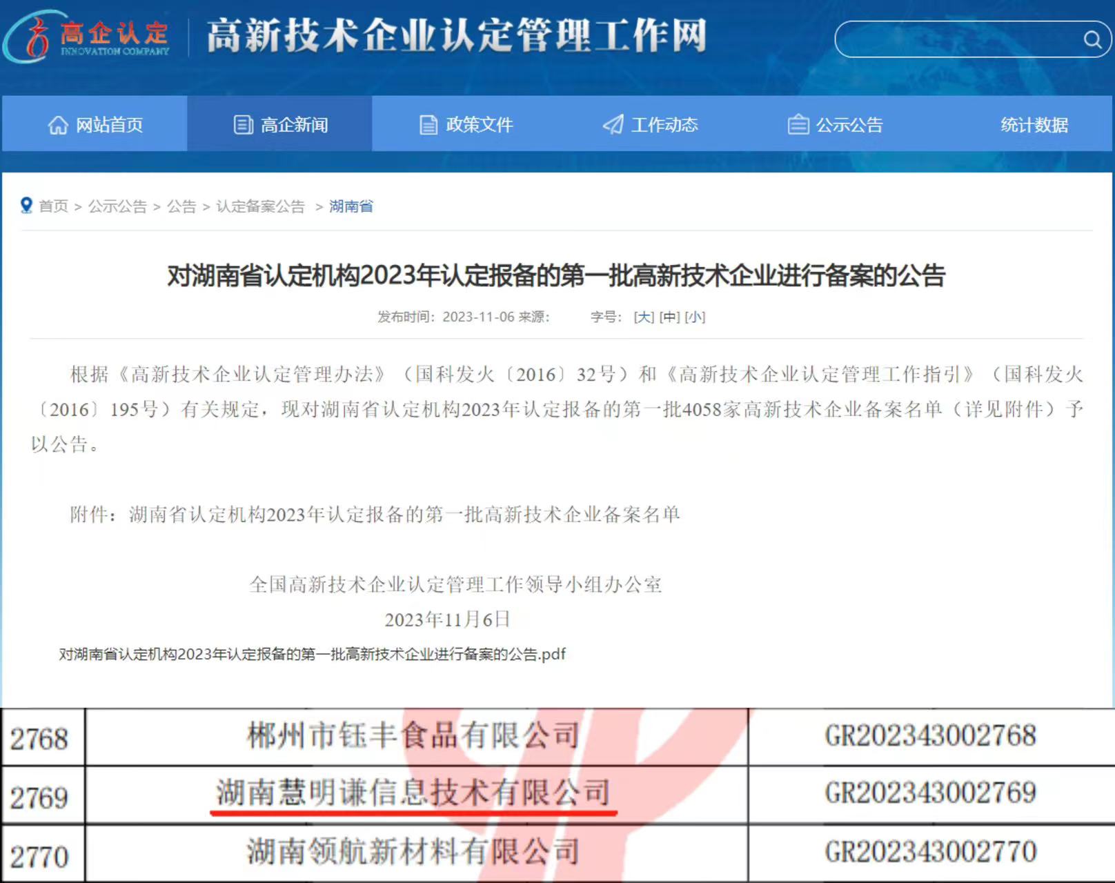对湖南省认定机构2023年认定报备的第一批高新技术企业进行备案的公告_湖南省_高新技术企业认定工作网