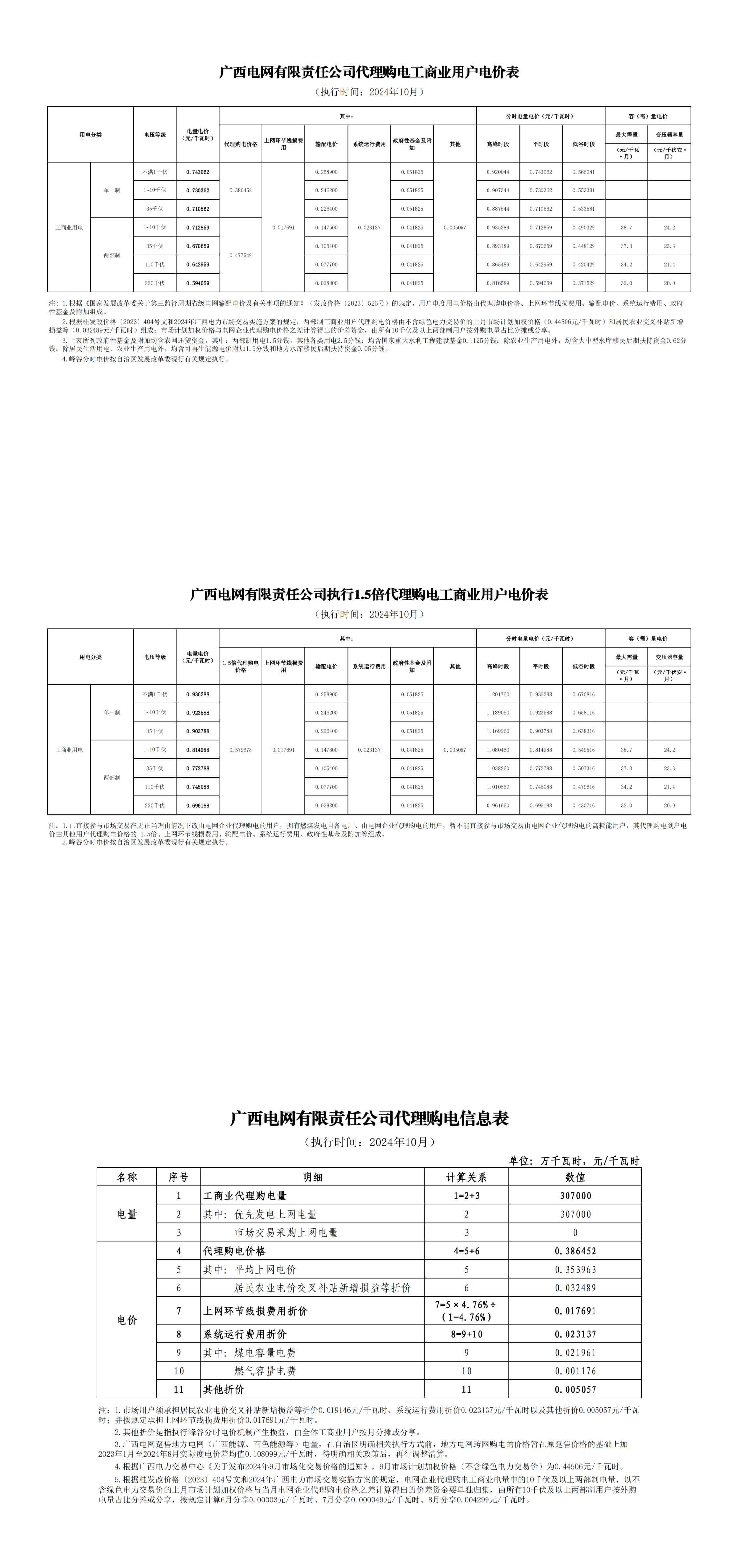 2024年10月份各省工商业电价(广东、深圳、广西、贵州、云南、海南)