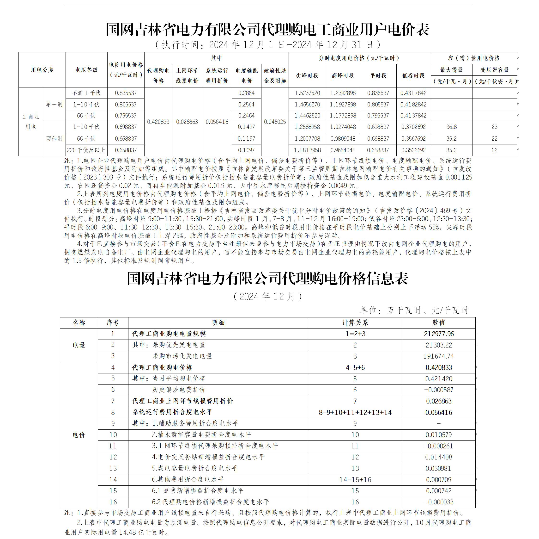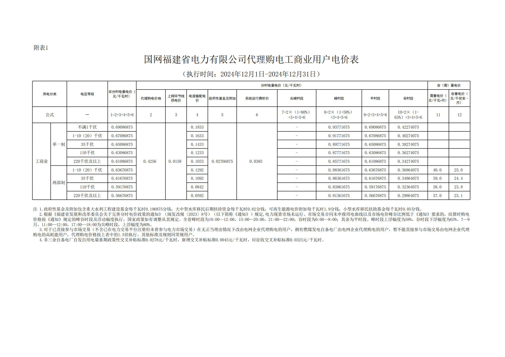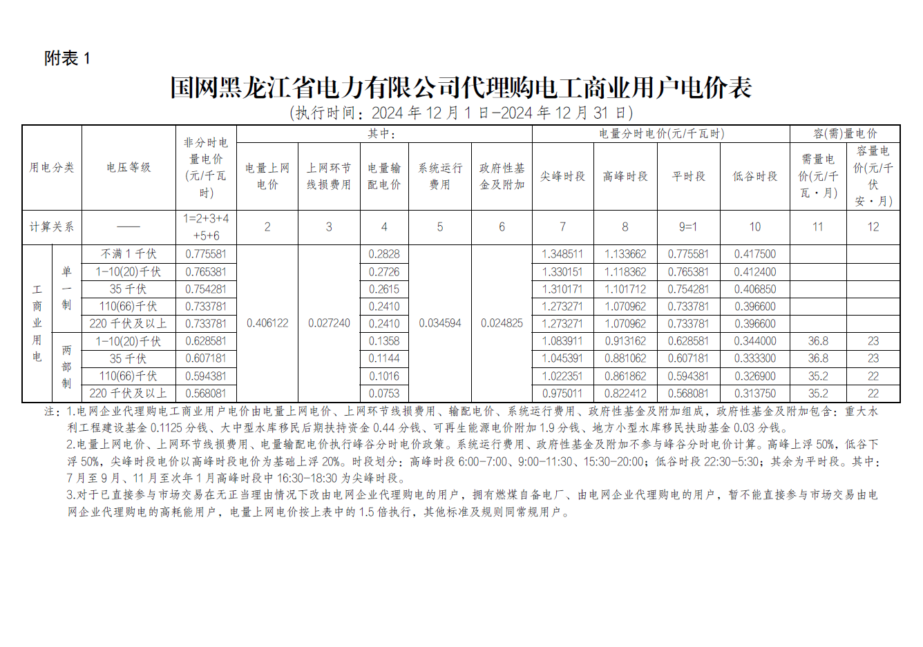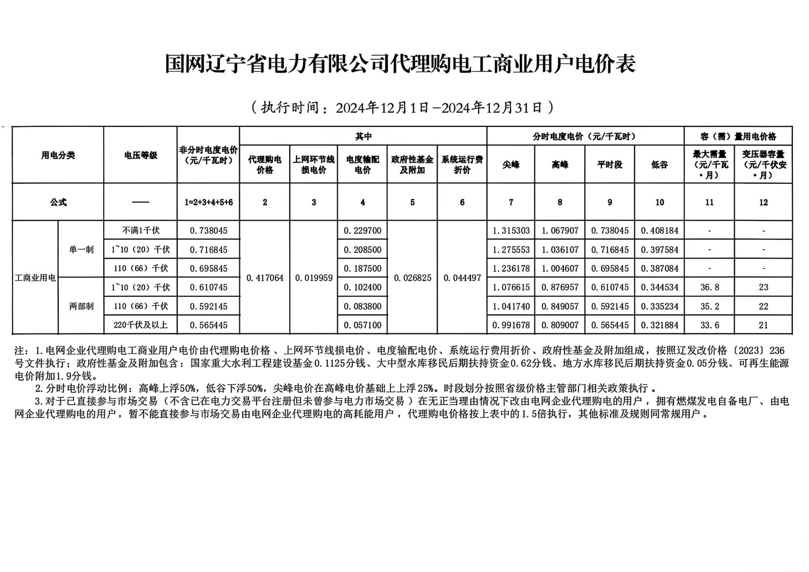 内蒙古(蒙东)12月份代理购电工商业用户电价表