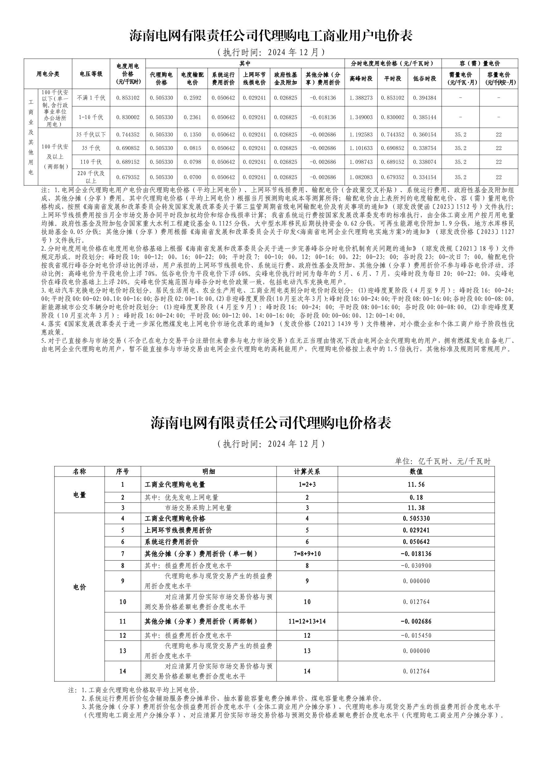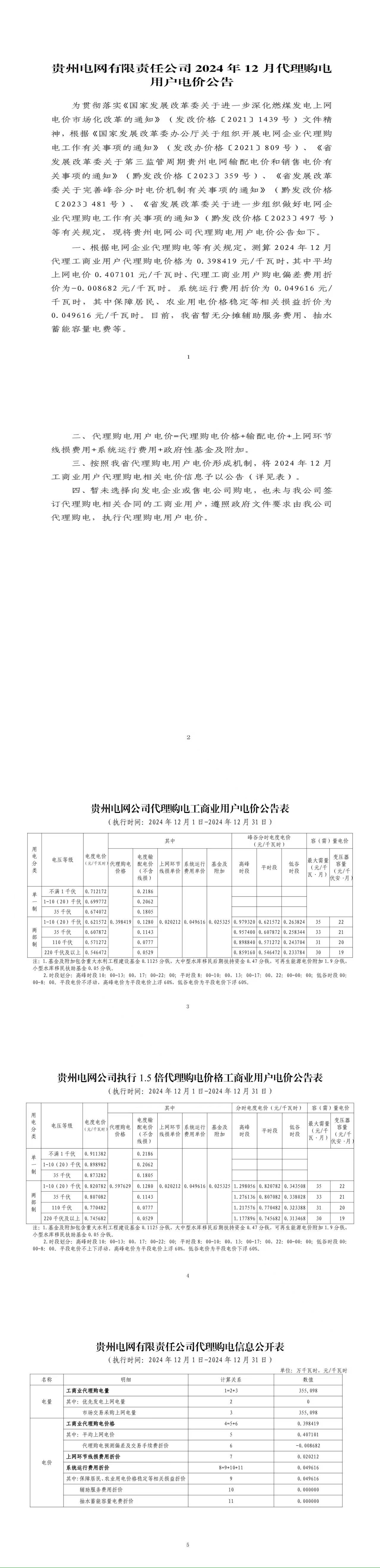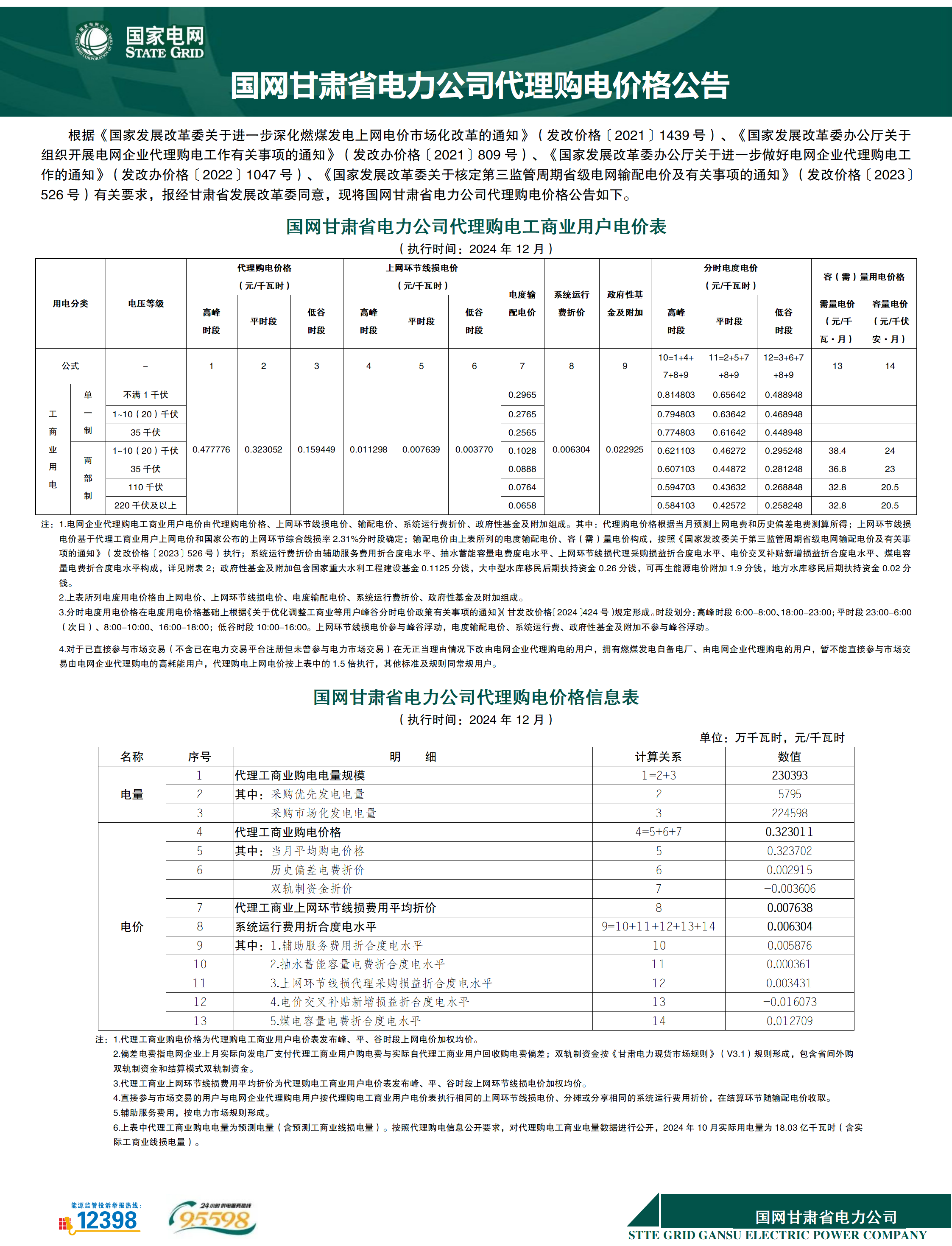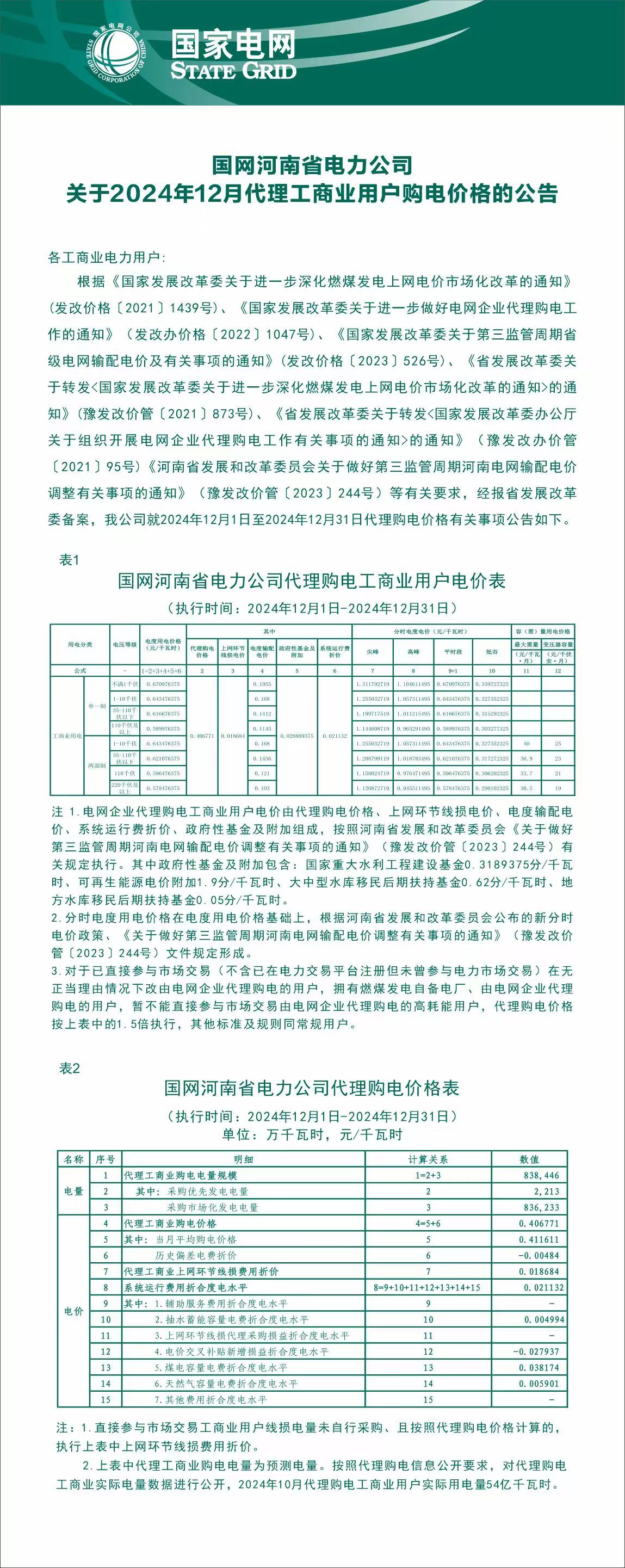 内蒙古(蒙东)12月份代理购电工商业用户电价表