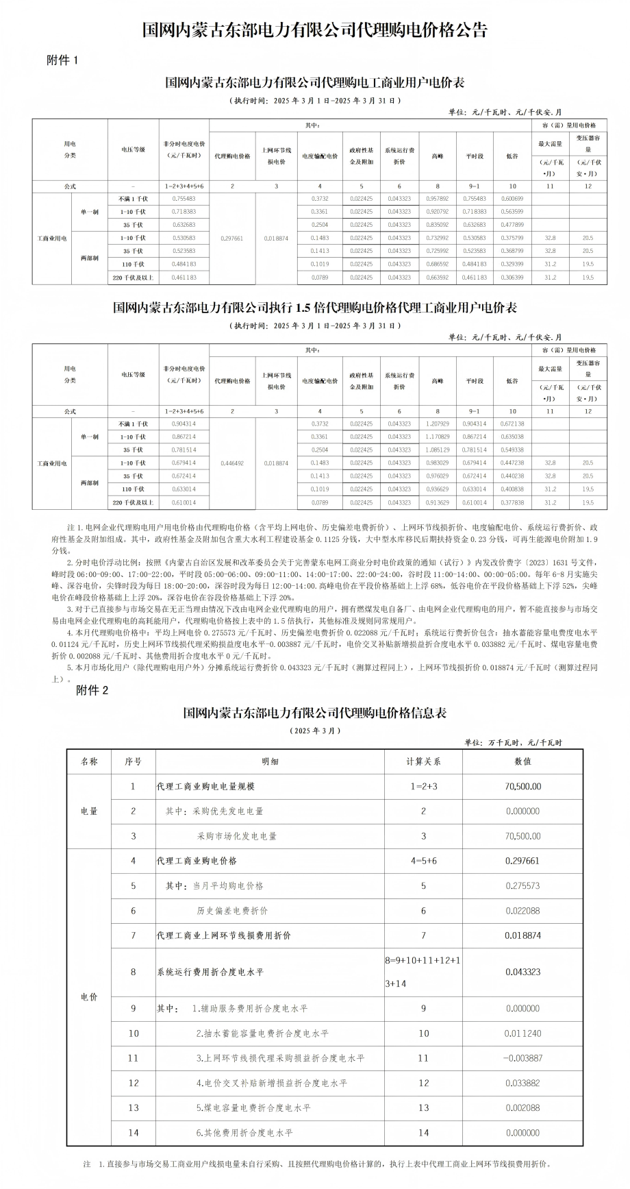内蒙古(蒙东)3月份代理购电工商业用户电价表