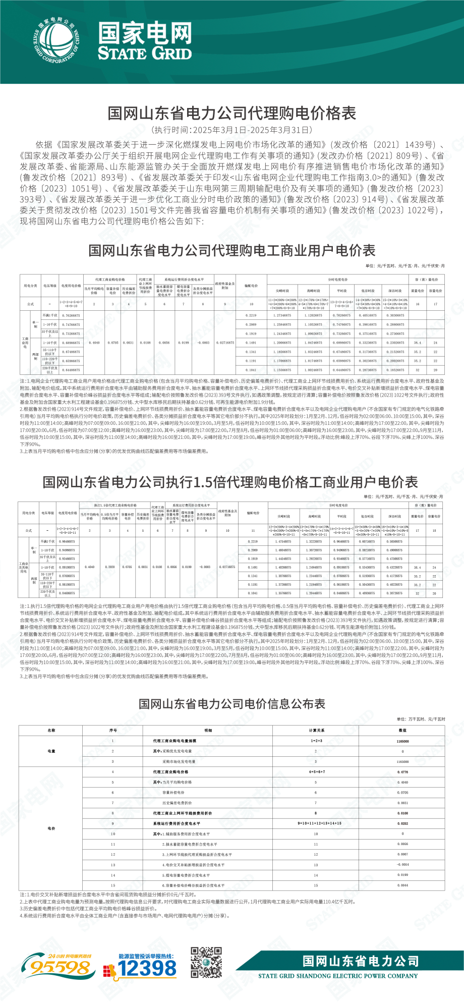 山东省3月份代理购电工商业用户电价表