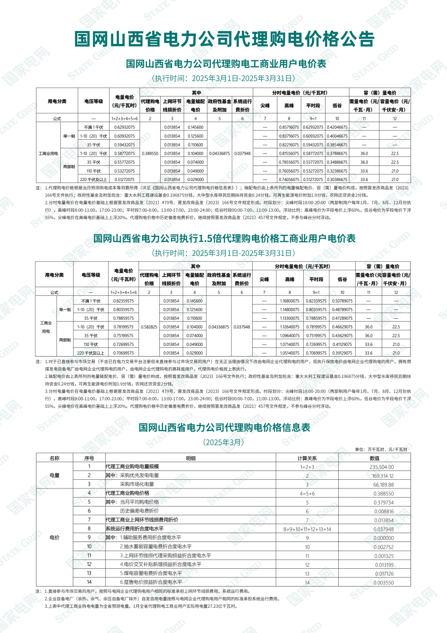 山西省3月份代理购电工商业用户电价表