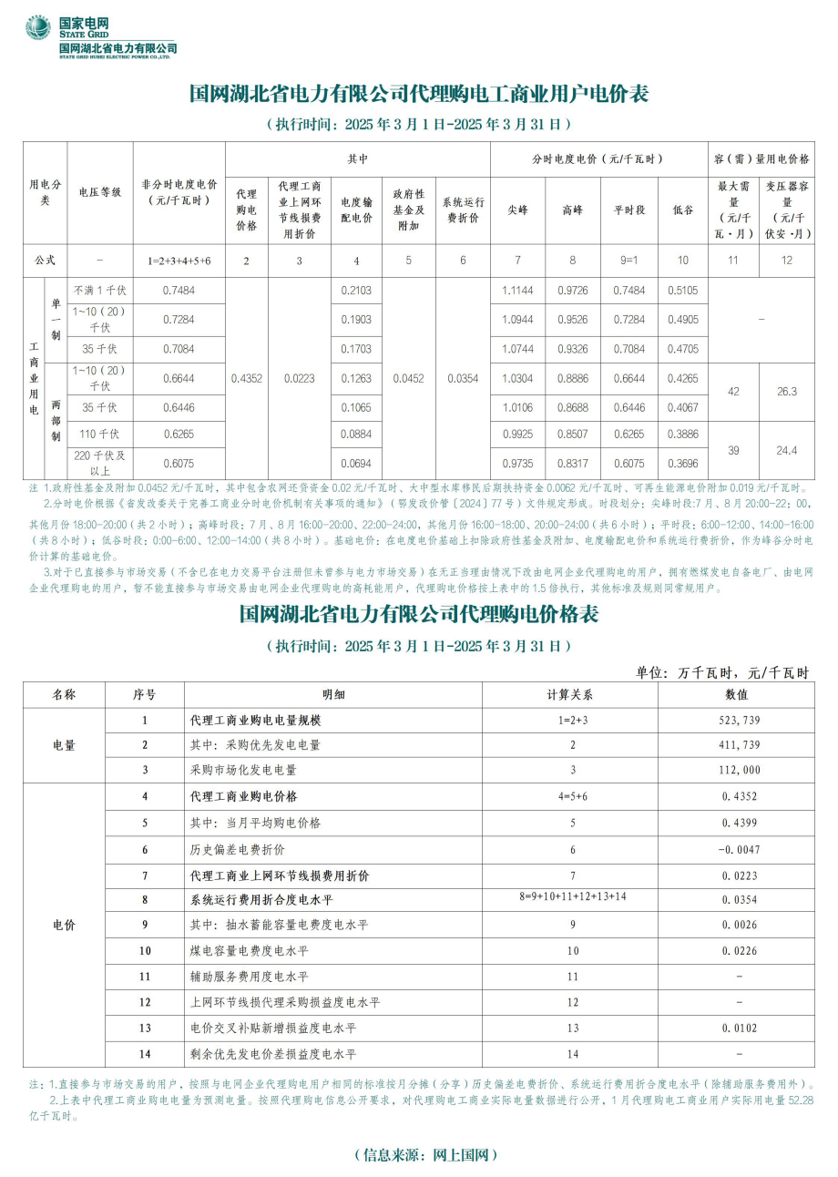 湖北省3月份代理购电工商业用户电价表