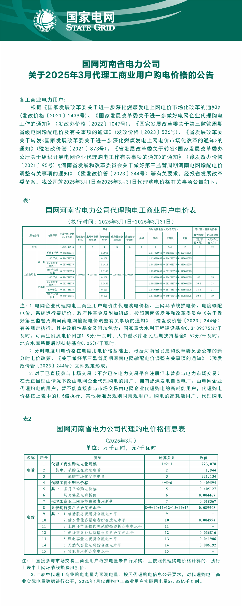 河南省3月份代理购电工商业用户电价表