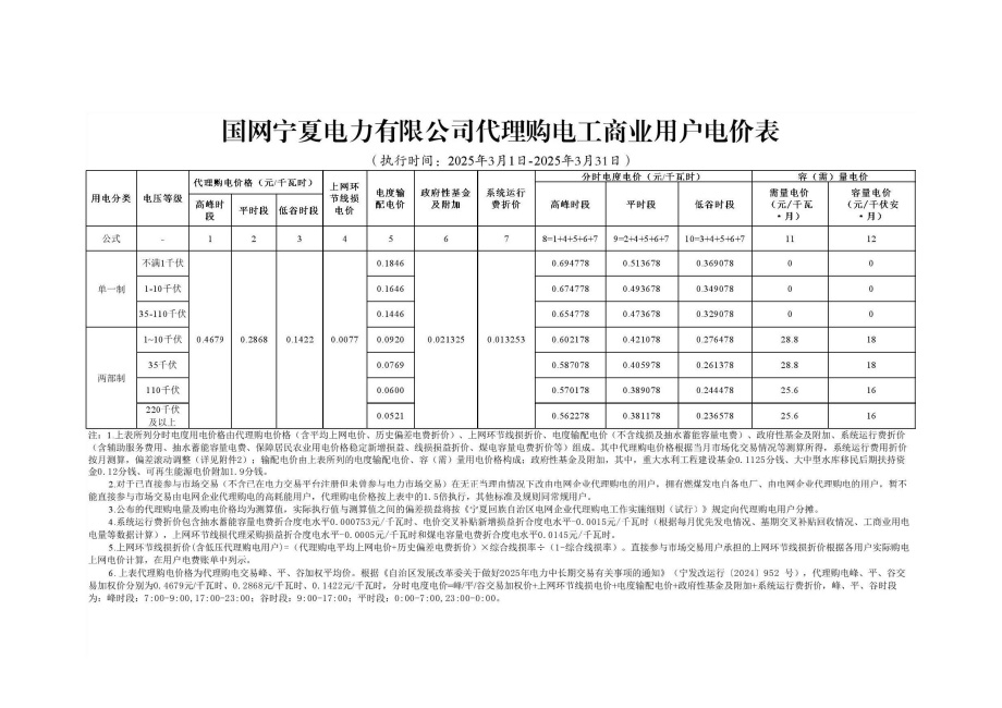 宁夏3月份代理购电工商业用户电价表