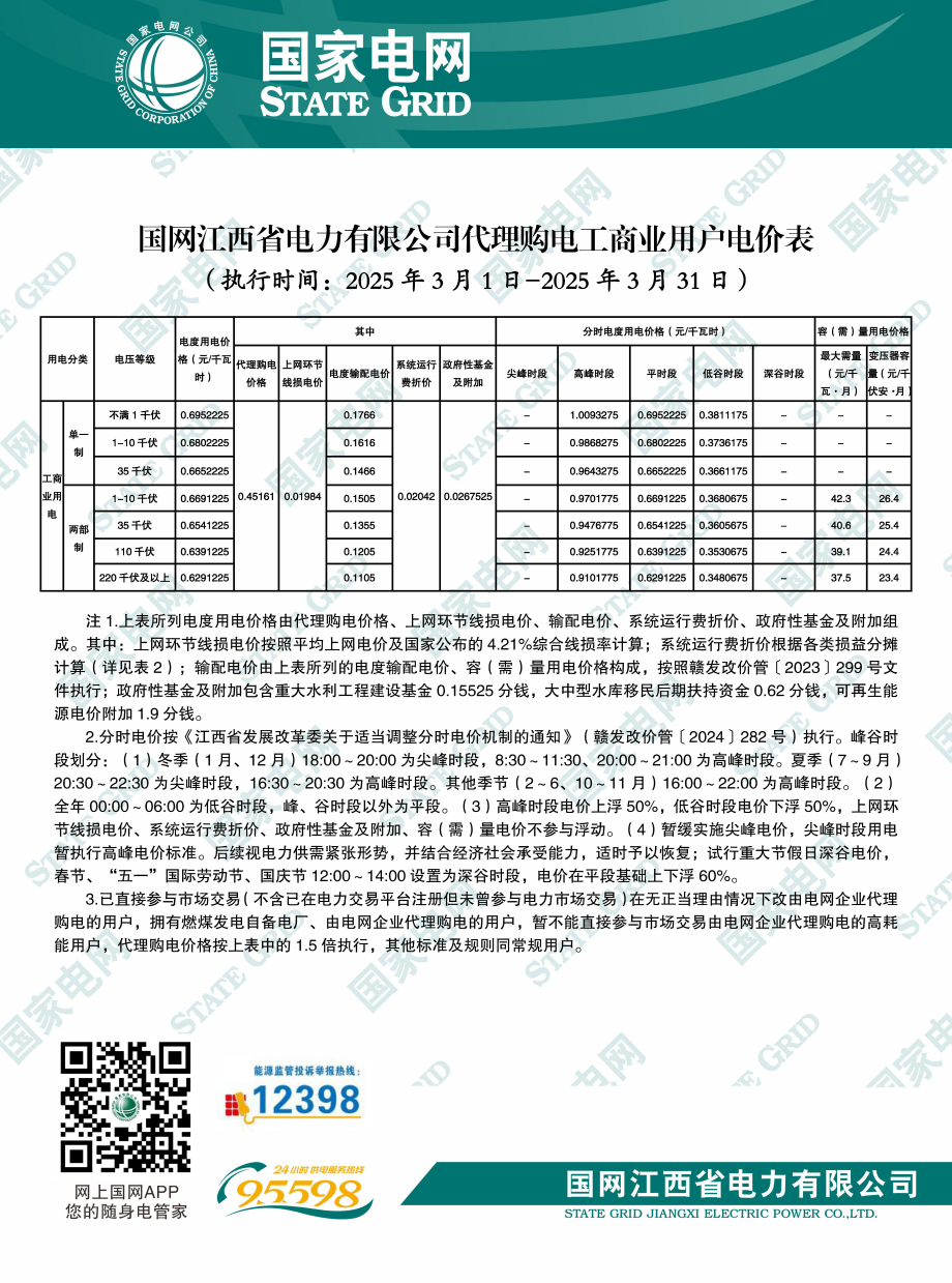 江西省3月份代理购电工商业用户电价表