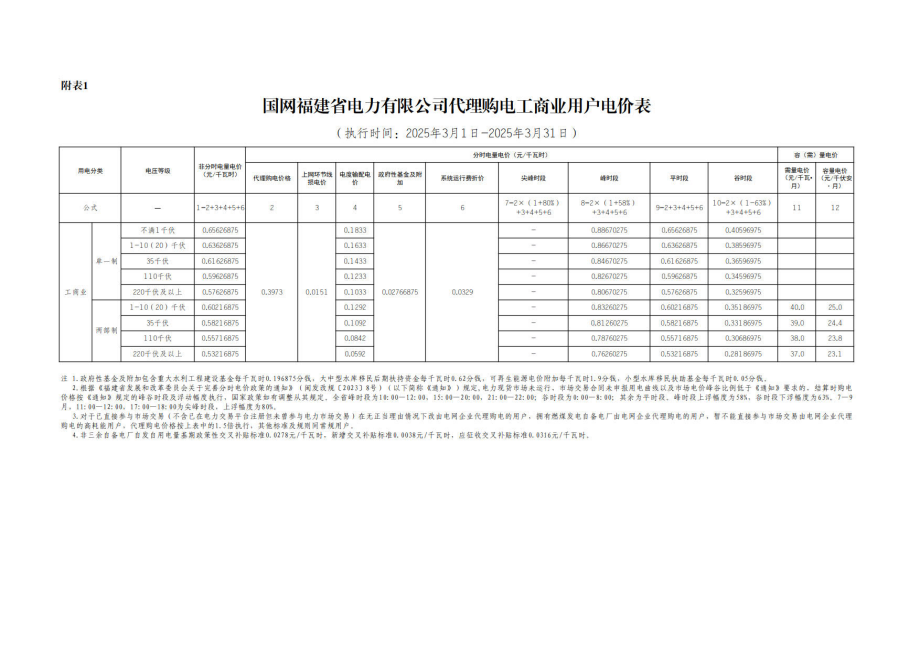 福建省3月份代理购电工商业用户电价表