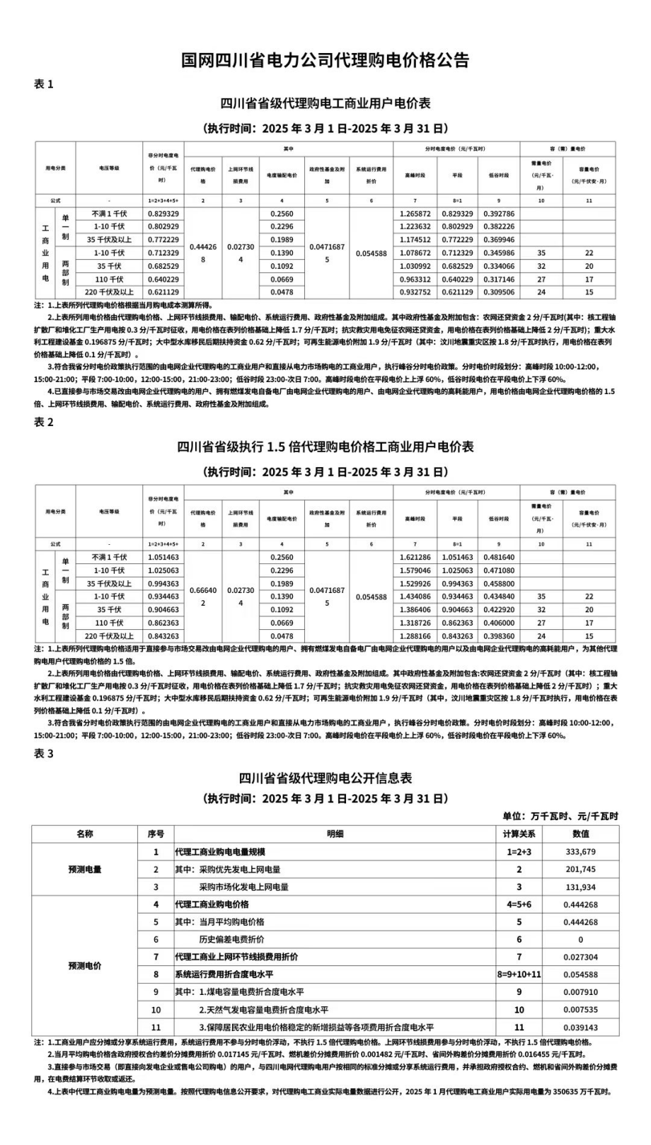 四川省3月份代理购电工商业用户电价表