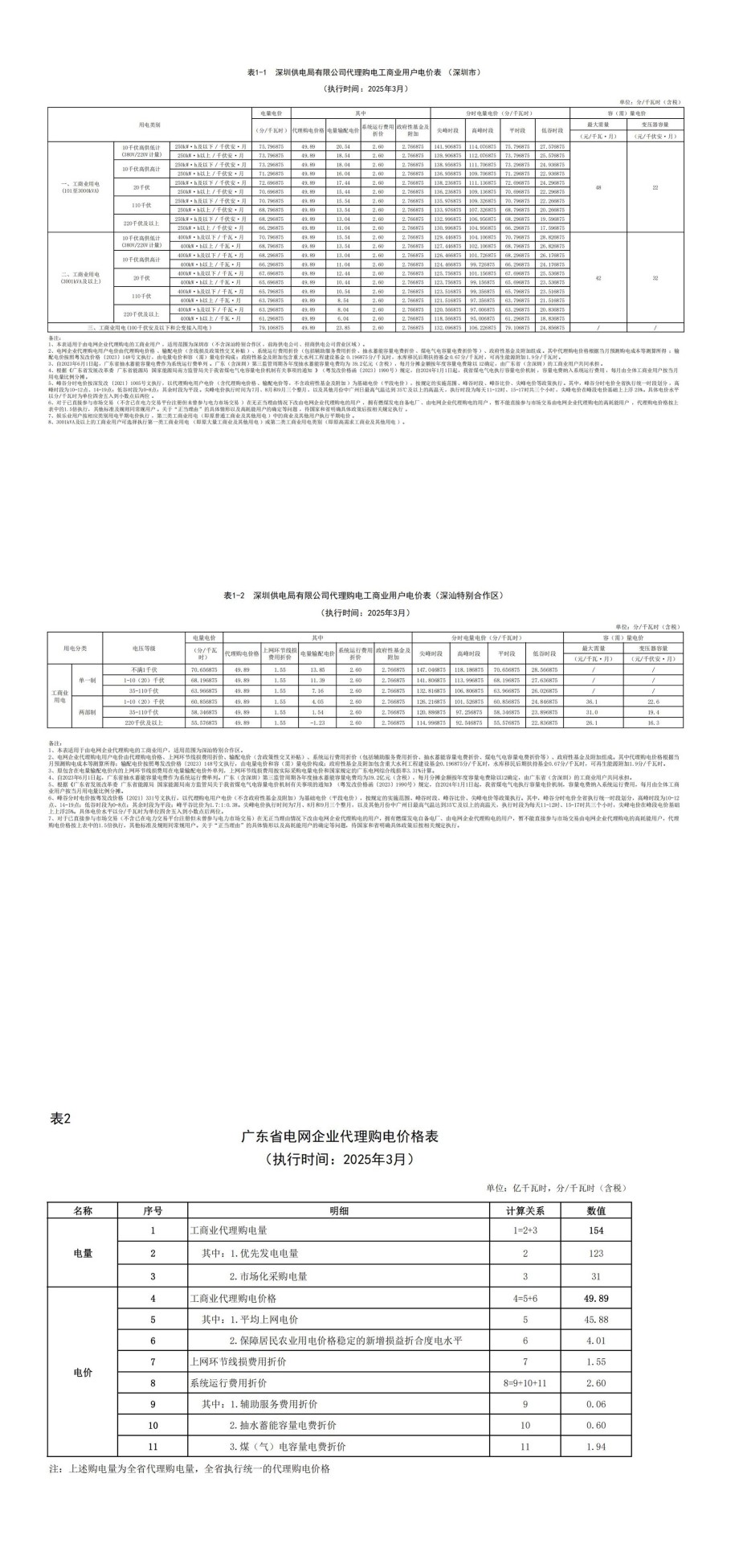 深圳市3月份代理购电工商业用户电价表