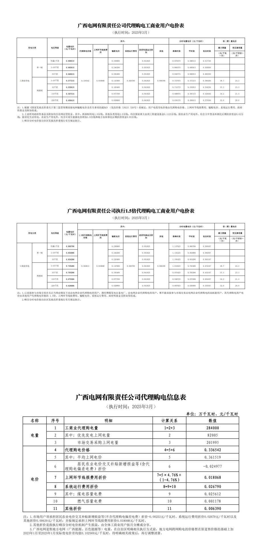 广西省3月份代理购电工商业用户电价表