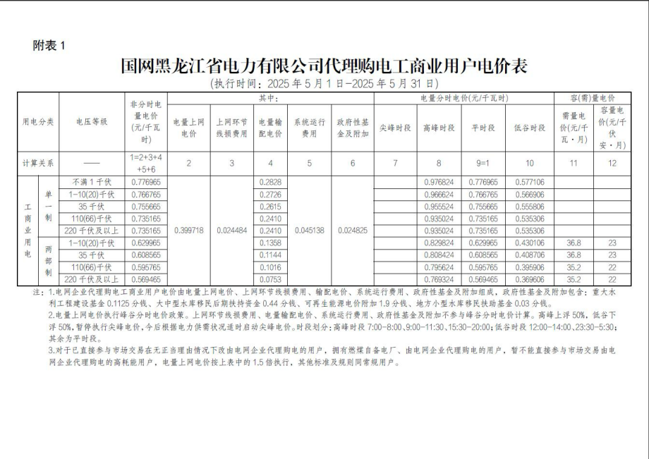 黑龙江省5月份代理购电工商业用户电价表