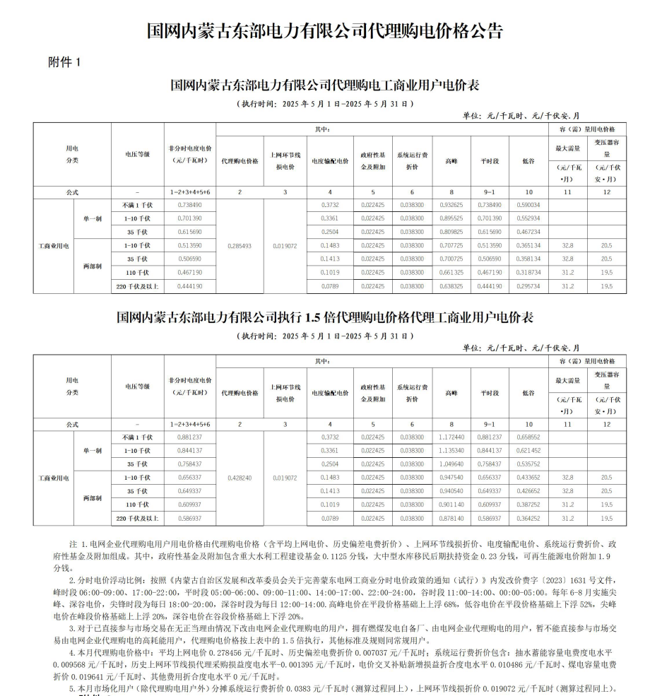 内蒙古(蒙东)5月份代理购电工商业用户电价表