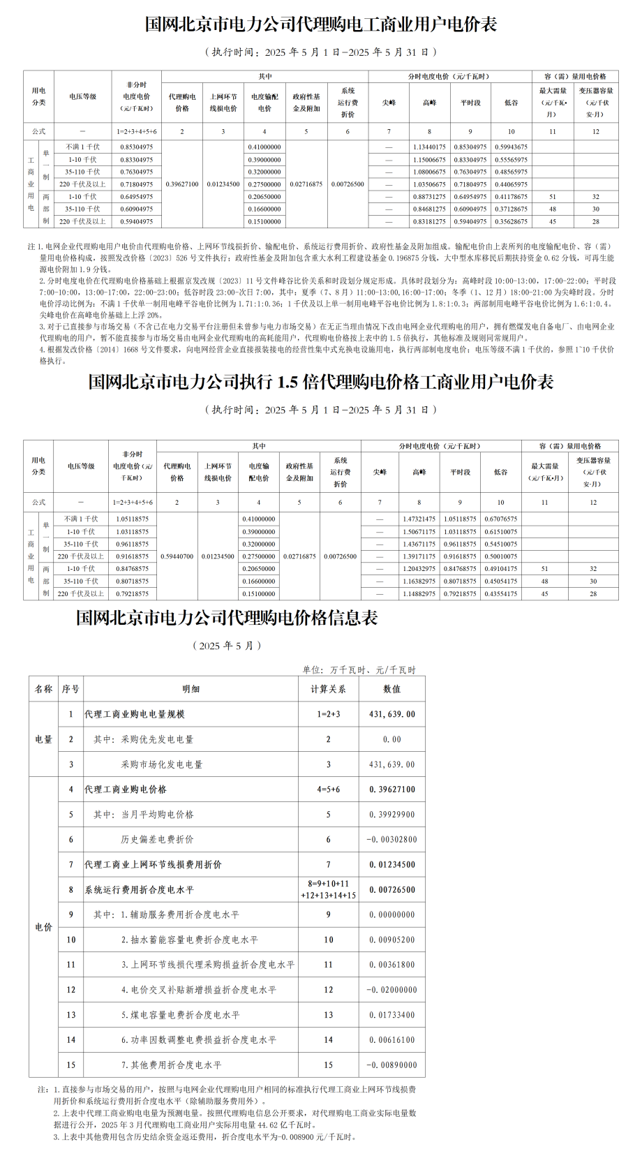 北京市5月份代理购电工商业用户电价表