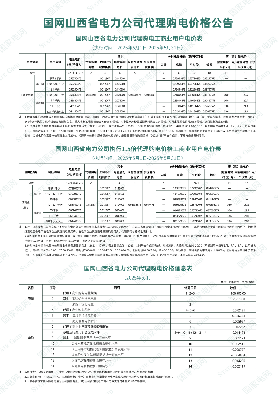 山西省5月份代理购电工商业用户电价表