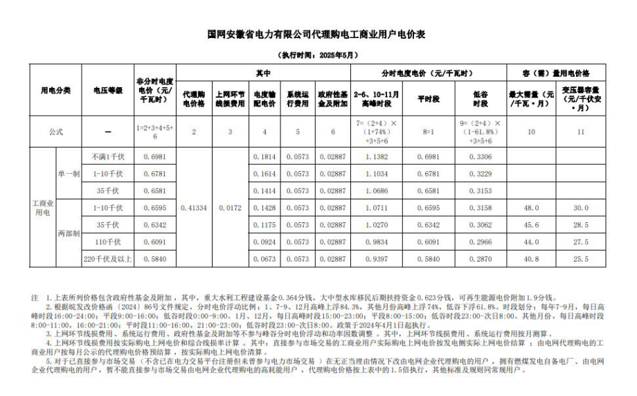 安徽省5月份代理购电工商业用户电价表