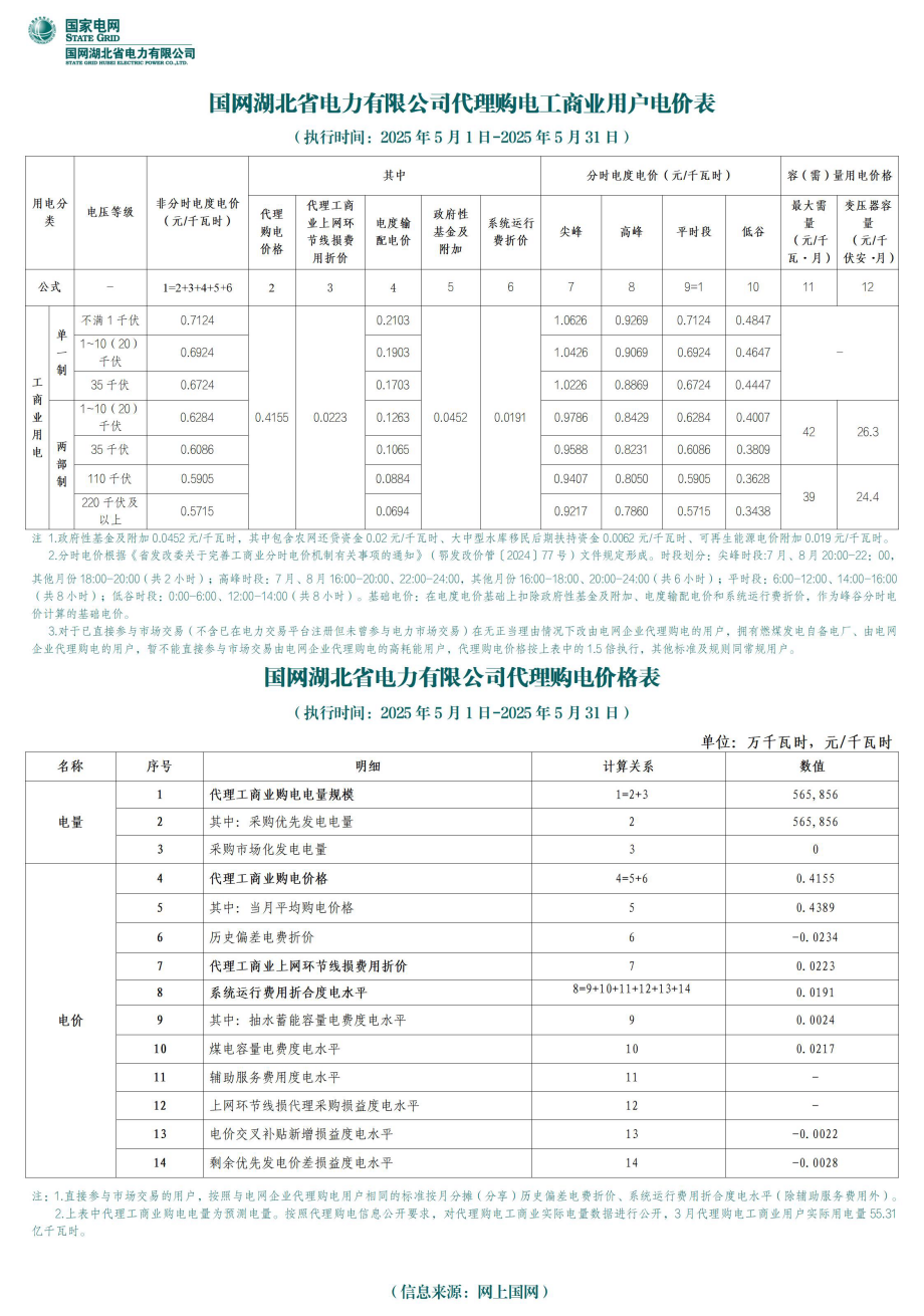 湖北省5月份代理购电工商业用户电价表
