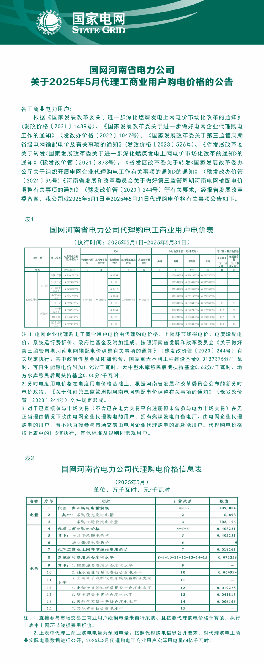 河南省5月份代理购电工商业用户电价表