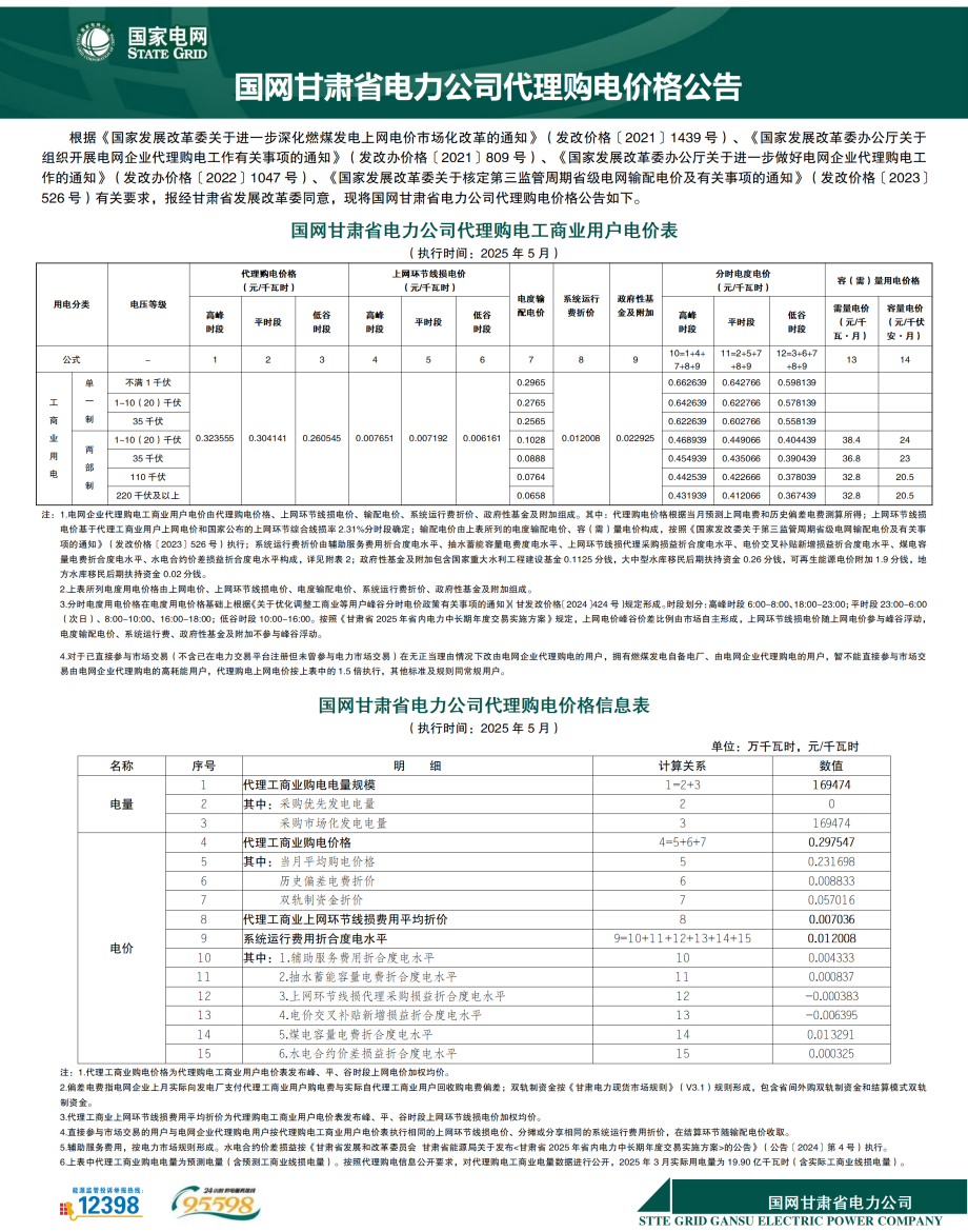 甘肃省5月份代理购电工商业用户电价表