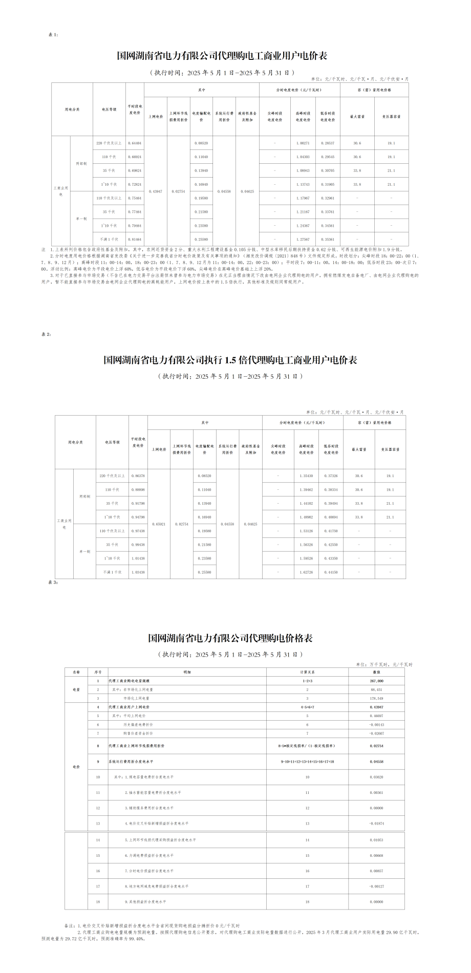 湖南省5月份代理购电工商业用户电价表