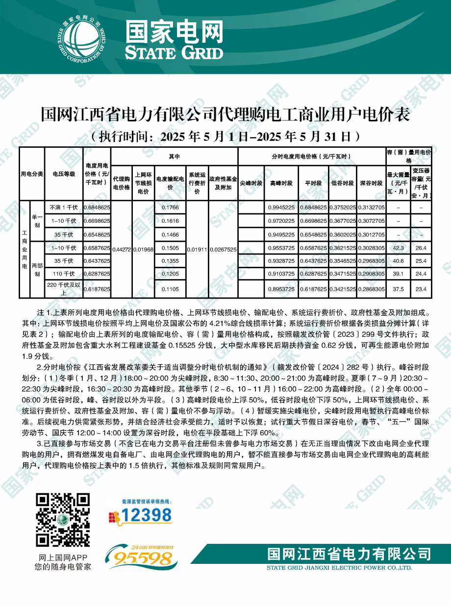 江西省5月份代理购电工商业用户电价表