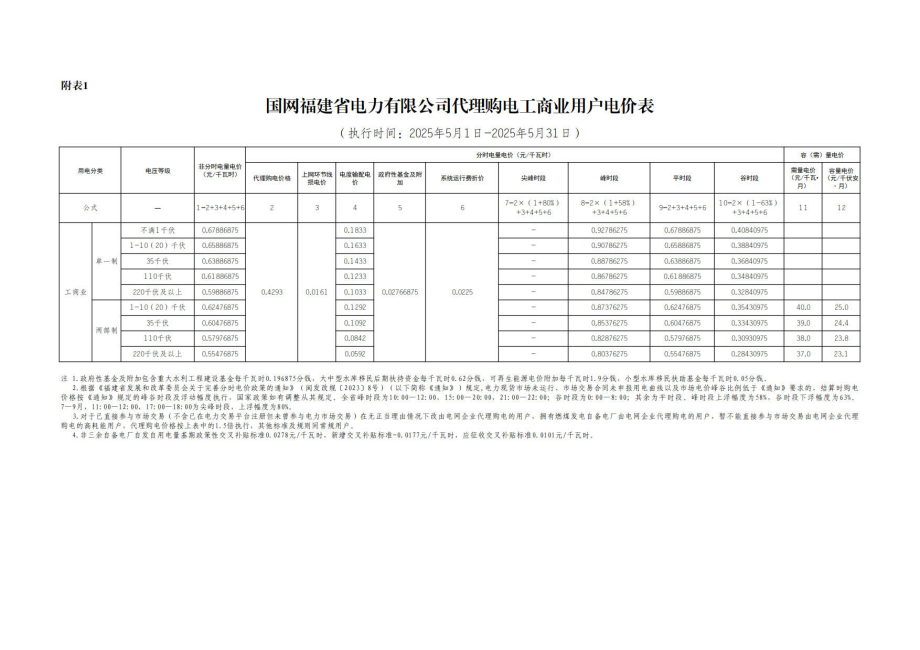 福建省5月份代理购电工商业用户电价表