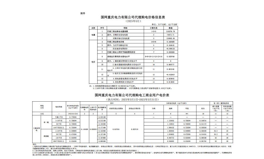 重庆市5月份代理购电工商业用户电价表