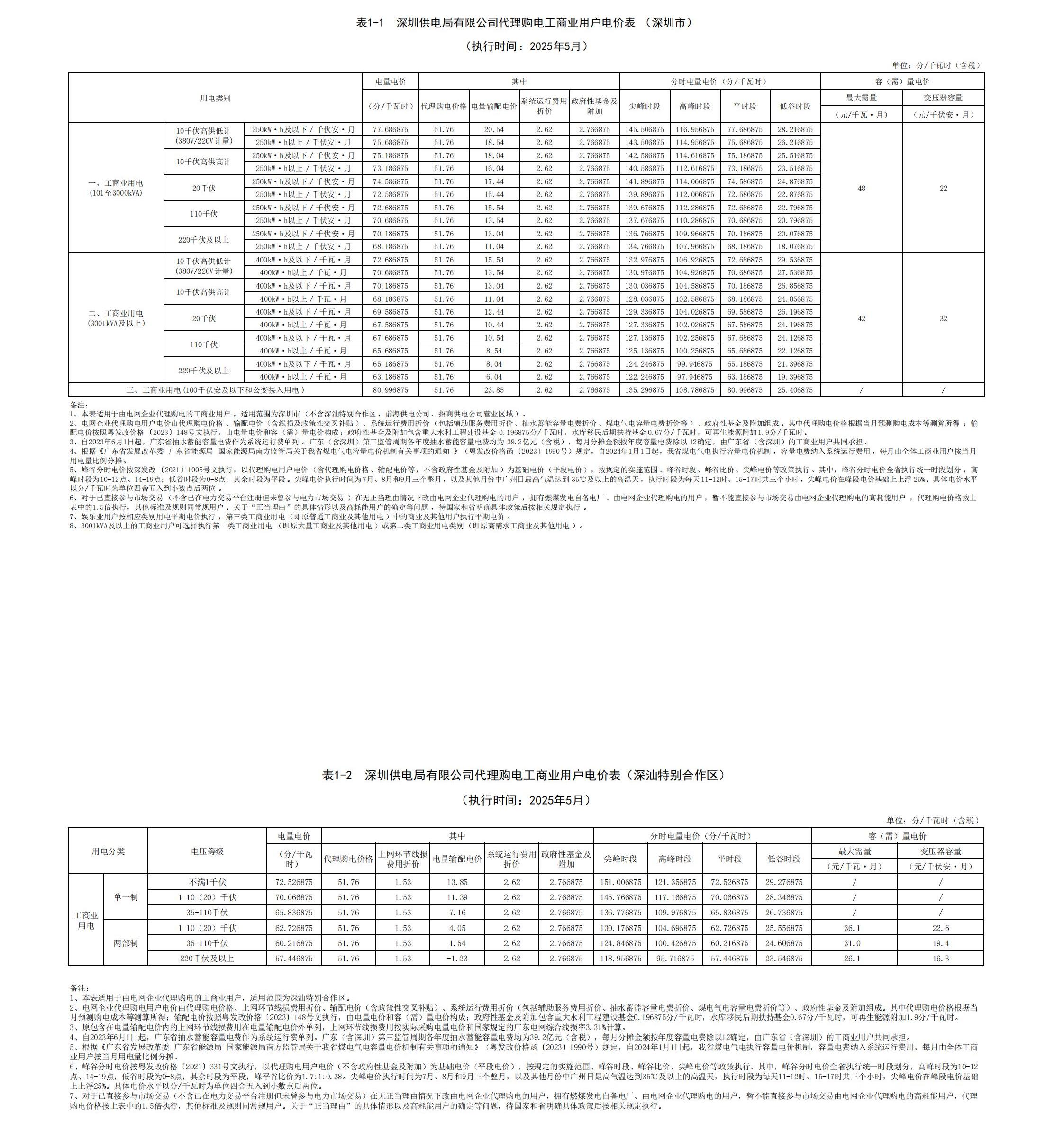 深圳市5月份代理购电工商业用户电价表