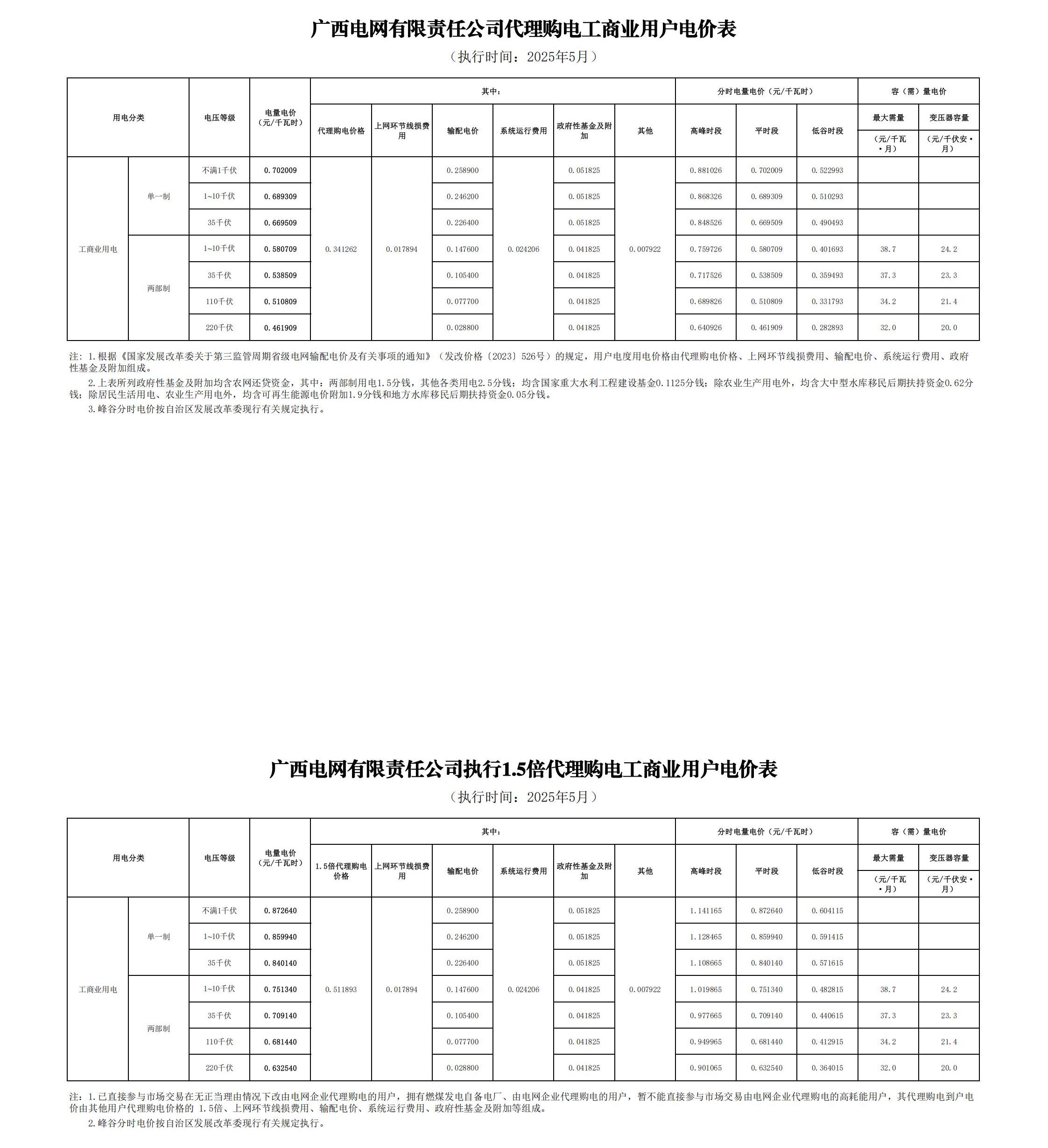 广西省5月份代理购电工商业用户电价表