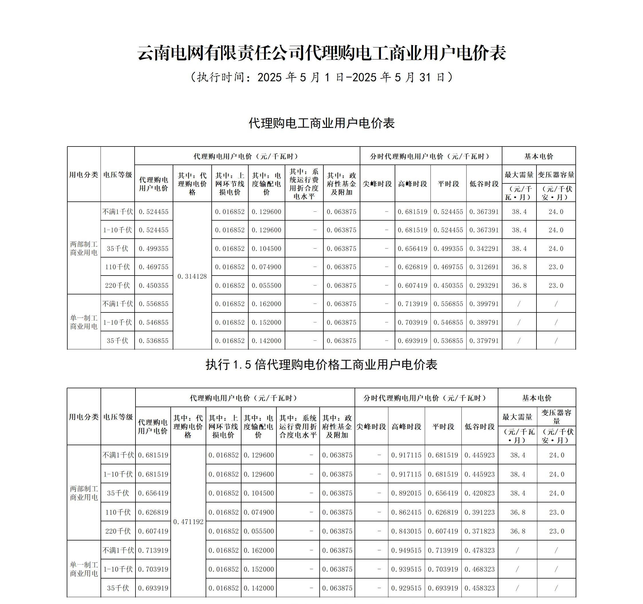 云南省5月份代理购电工商业用户电价表