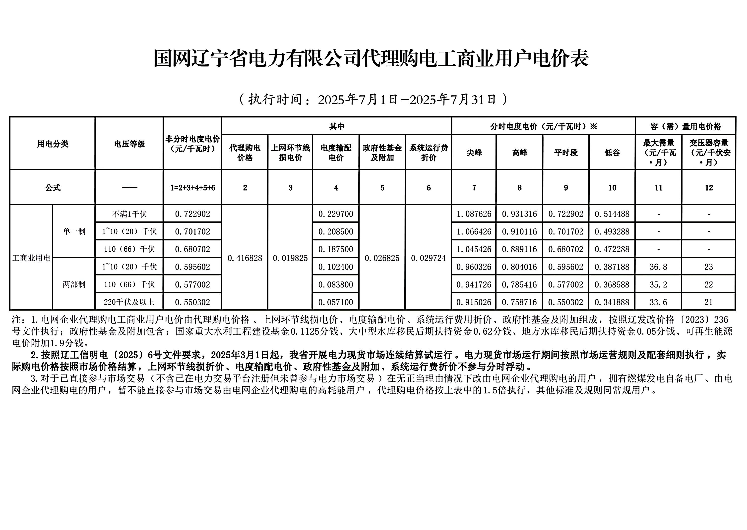 辽宁省7月份代理购电工商业用户电价表