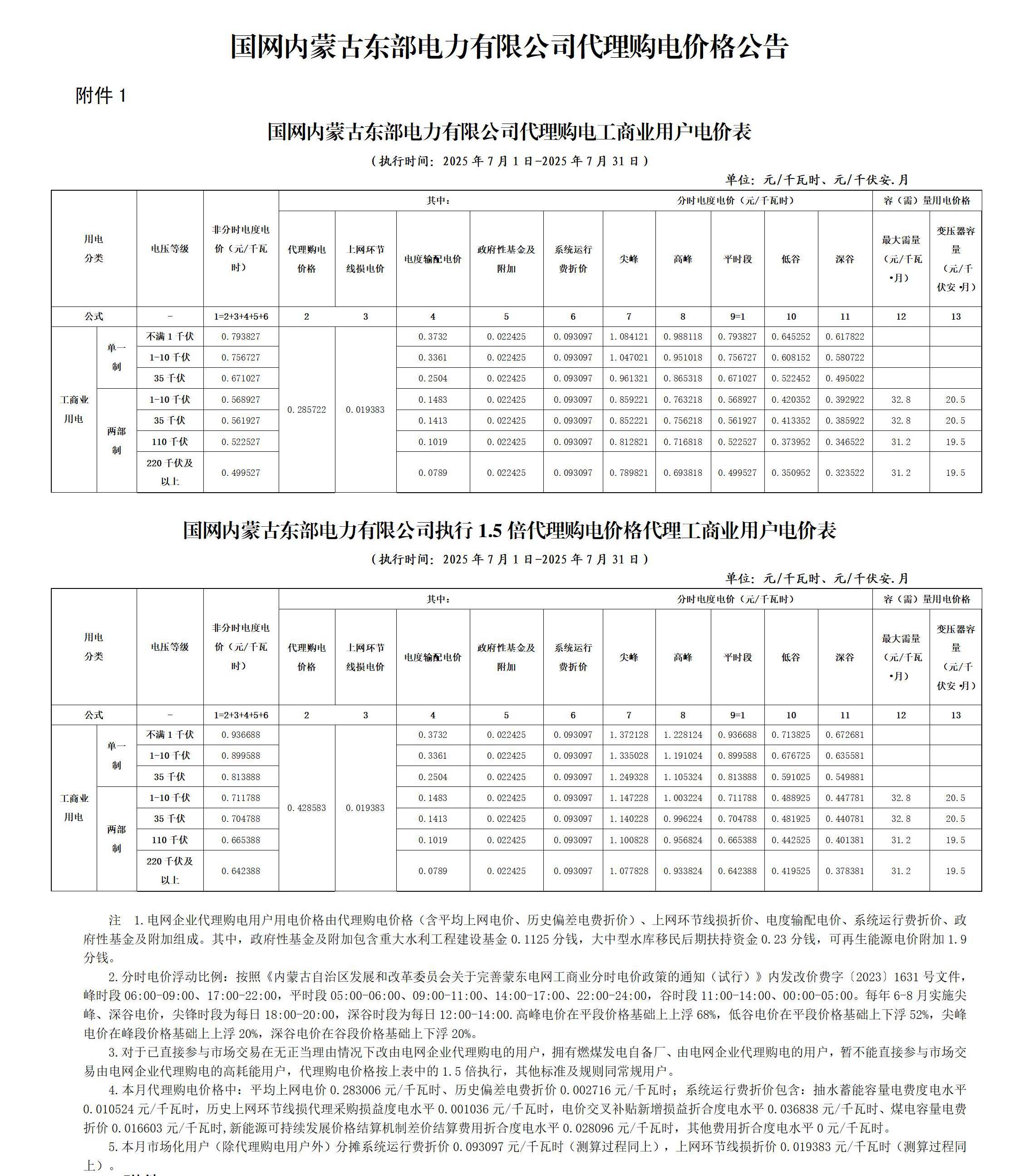 内蒙古(蒙东)7月份代理购电工商业用户电价表