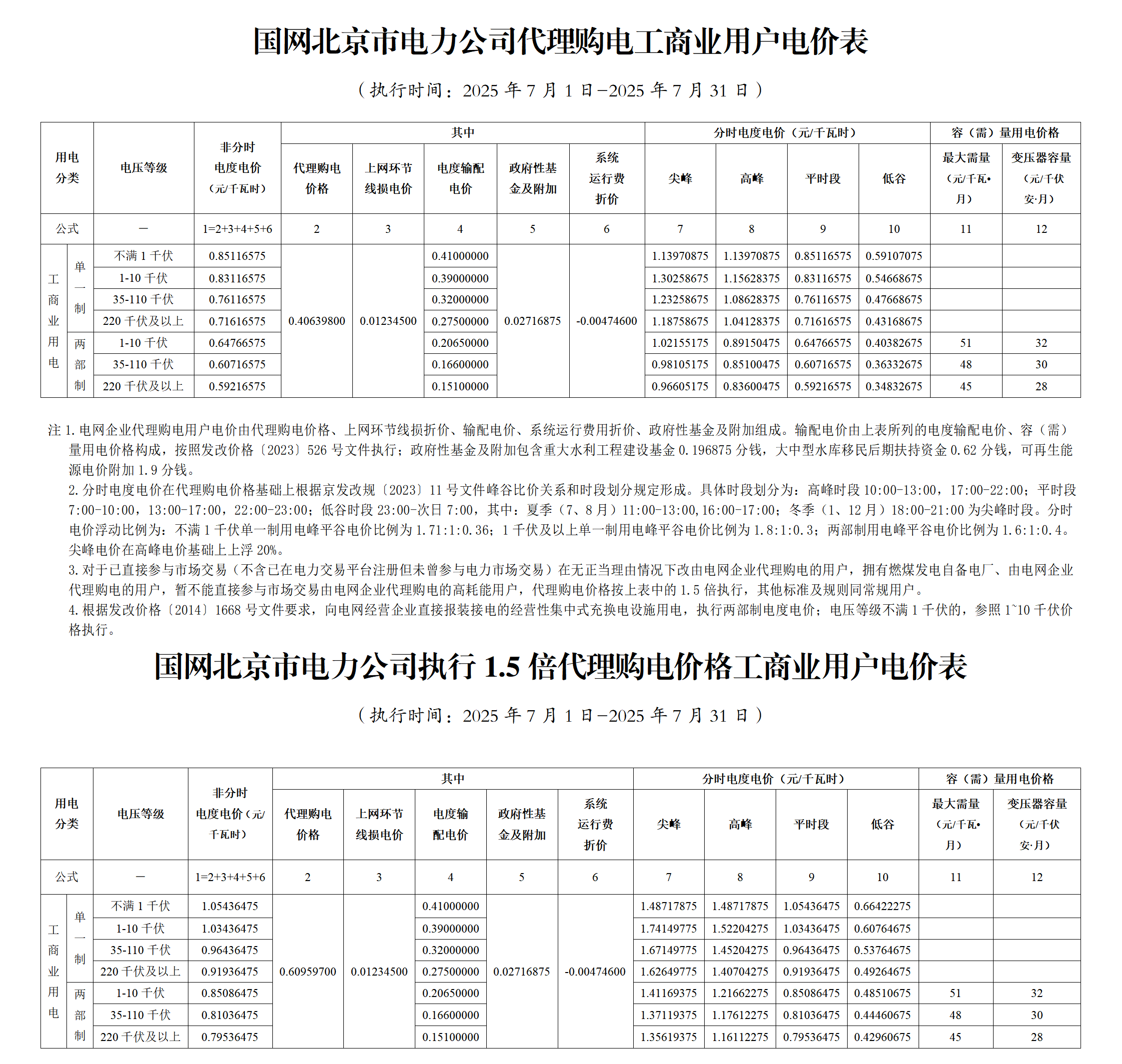 北京市7月份代理购电工商业用户电价表