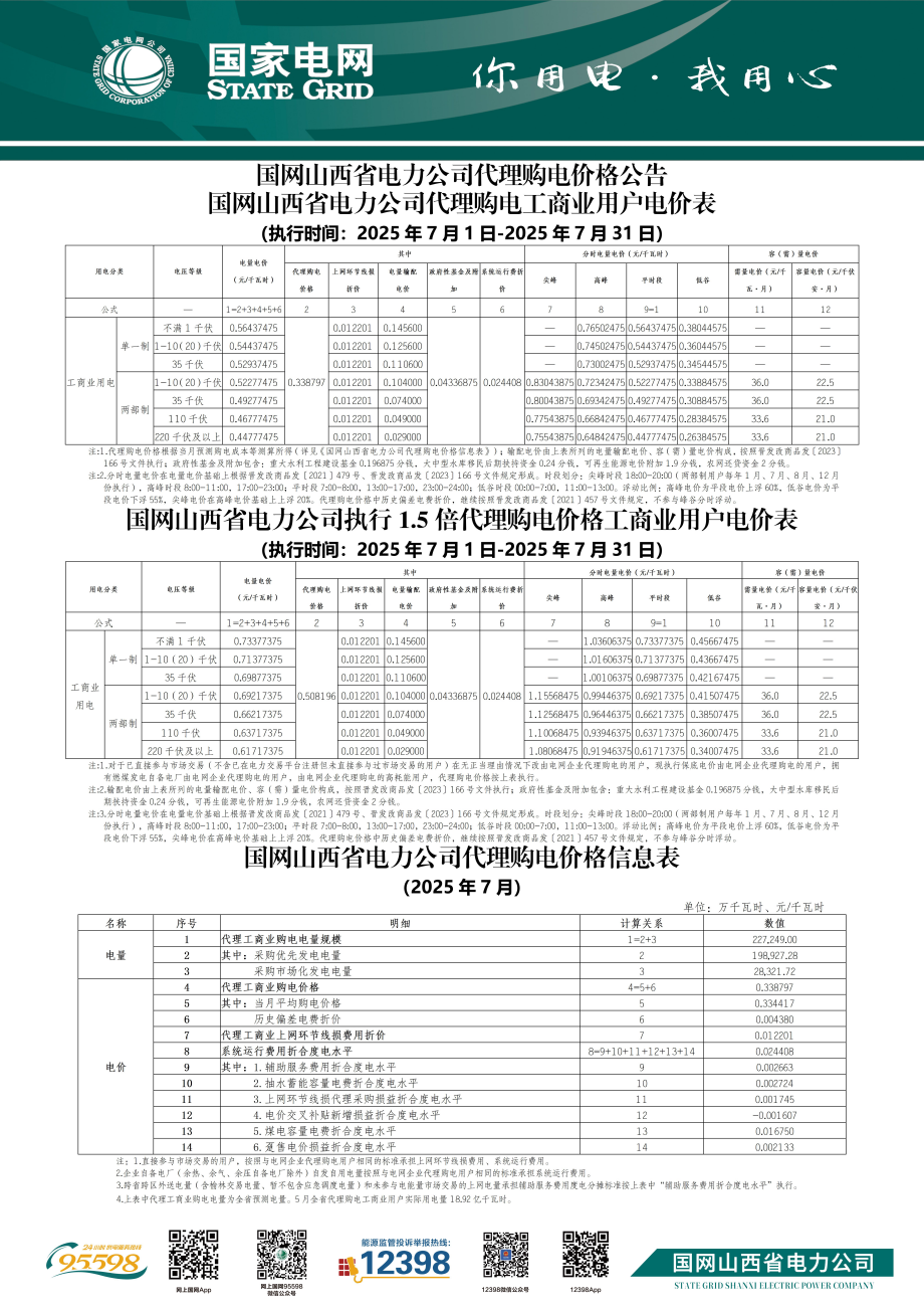 山西省7月份代理购电工商业用户电价表